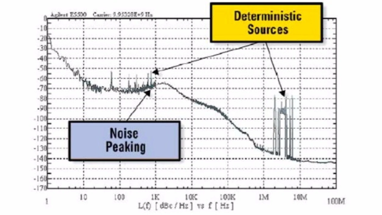 Phasenrauschmessungen geben hilfreiche Einsichten in PLL- oder Quarz-oszillator-Schal tungen und unterstützen bei der Identifikation von determi nis-tischem Jitter infolge von Störsignalen. Solche Messungen sind nützlich, wenn man Schaltungen zur Taktrückgewinnung optimiert oder interne Quellen von Nadelimpulsen und Rauschen erkennen will.