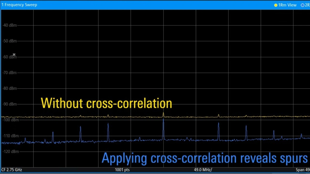 Ein zentraler Aspekt dieser neuen Architektur ist die Möglichkeit, das vom Gerät selbst eingeführte Rauschen zu eliminieren. Die integrierte Kreuzkorrelationstechnologie erlaubt es dem FSWX, sein eigenes Grundrauschen zu unterdrücken und so Signale zu erfassen, die andernfalls übersehen worden wären (Bild 2). Vor allem in der Spektrumanalyse ist diese Fähigkeit alles entscheidend, wenn es auf die Erfassung kleiner Nebenlinien oder schwacher Signale nicht weit über dem thermischen Rauschpegel ankommt. Das Ergebnis ist eine dramatische Verbesserung des Dynamikbereichs, mit der genauere und zuverlässigere Messungen möglich werden.