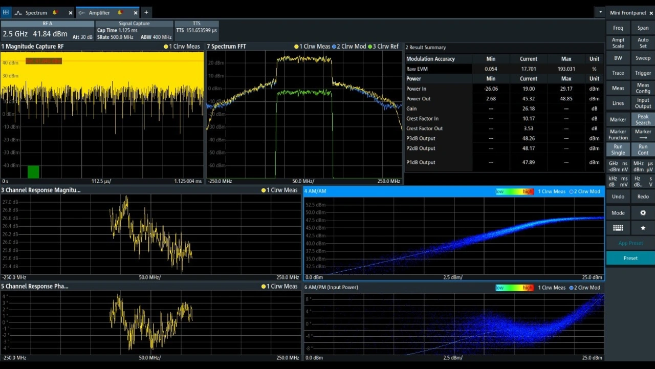 Ingenieure, die Verstärker charakterisieren müssen, profitieren von der simultanen Eingangs- und Ausgangssignalanalyse des FSWX. Durch die Echtzeiterfassung der Eingangs- und Ausgangssignale eines Verstärkers ermöglicht der FSWX die direkte Messung des durch Nichtlinearitäten verursachten Anstiegs der Leistung in den Nachbarkanälen, sowie der AM-AM- oder AM-PM-Umsetzung in der Nähe des Kompressionspunkts (Bild 4). Diese ganzheitliche Betrachtung der Verstärker-Performance vereinfacht den Charakterisierungsprozess und bietet eine gründlichere Analyse.
