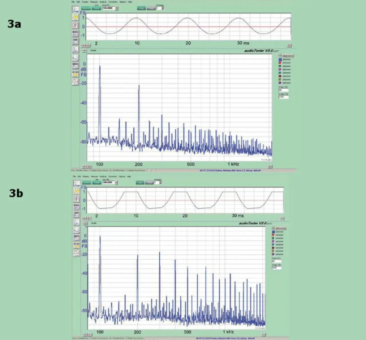 Bild 3 zeigt ein mit einem Rife-Vince-Fenster aufgenommenes Spektrum. Die zu prüfende Schaltung ist in diesem Fall ein einfacher Vorverstärker, angesteuert mit 100-Hz- Sinussignalen verschiedener Pegel. In Bild 3a ist oben das Ausgangssignal wiedergegeben; man sieht hier nicht unbedingt auf den ersten Blick, dass die Kurve bereits leicht verbogen ist. Im unteren Bildteil ist das Ausgangsspektrum zu sehen, es zeigt sich bereits eine deutliche Linie bei 200 Hz.