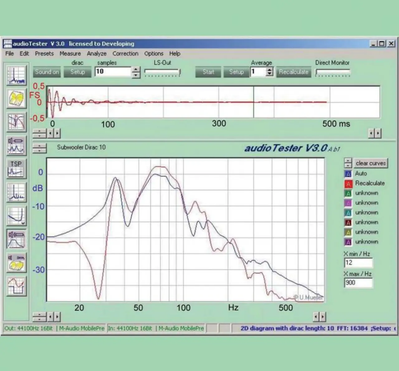 Kein Verstärker arbeitet vollständig frei von Verzerrungen. Für seine Wiedergabequalität ist maßgeblich, wie stark sie sind und wie sie sich spektral zusammensetzen. Auch das ist mit Audiotester messbar. Dazu gibt die Soundkarte ein passendes Signal ab (Sinus, Dreieck, Rechteck, weißes oder rosa Rauschen), das das Versuchsobjekt durchläuft und anschließend im PC einer schnellen Fourier-Analyse (FFT) unterzogen wird. Unter einer ganzen Reihe von verschiedenen Fenstern ist das für den jeweiligen Fall günstigste wählbar.