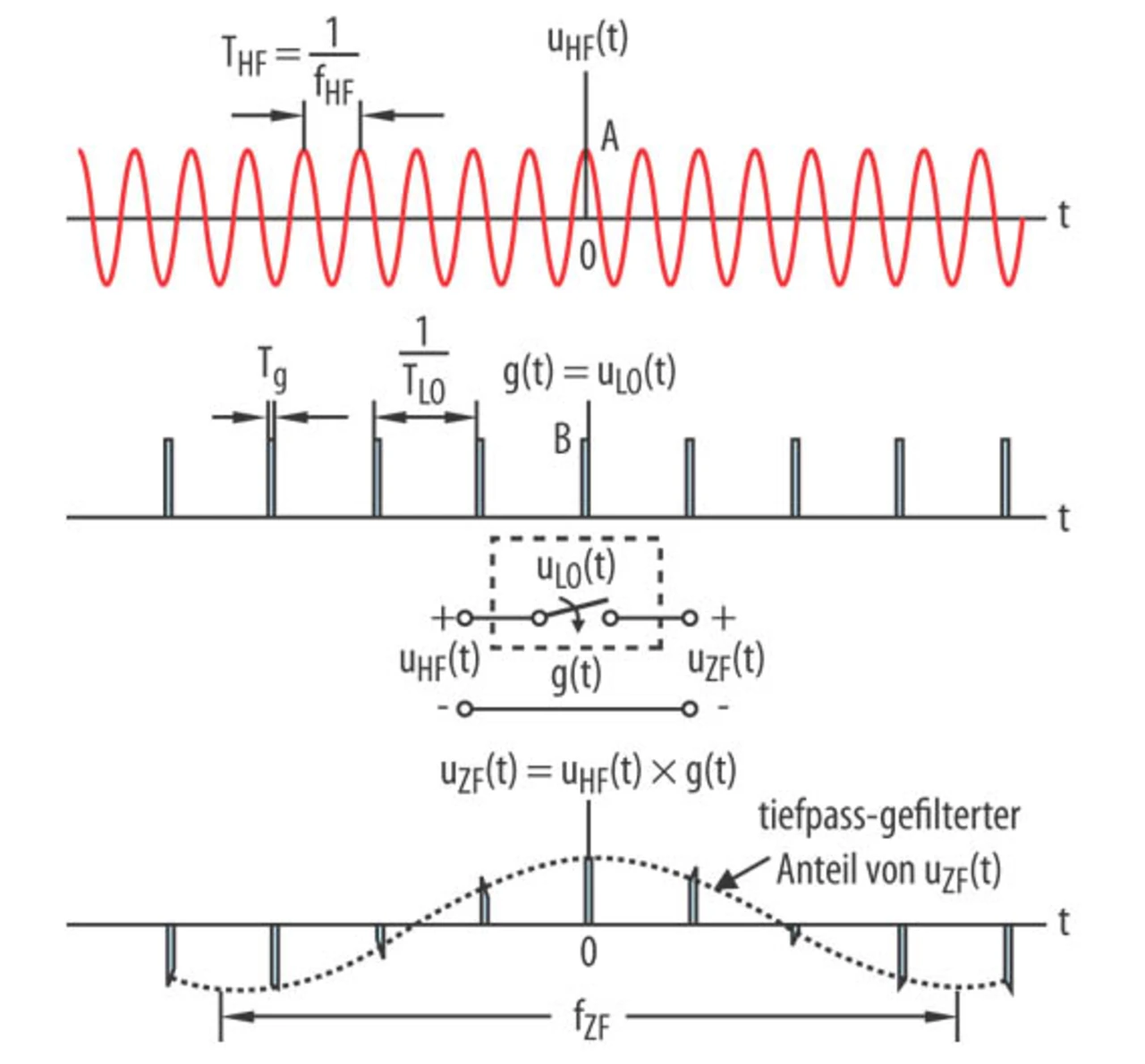 Eine Veranschaulichung des Funktionsprinzips wird in Bild 2 für eine Darstellung im Zeitbereich gezeigt. Hier treten Abtastwerte einer sinusförmigen HF-Welle mit der Periode T HF am Ausgang eines idealen Schalters auf, der mit einer Frequenz von TLO angesteuert wird.