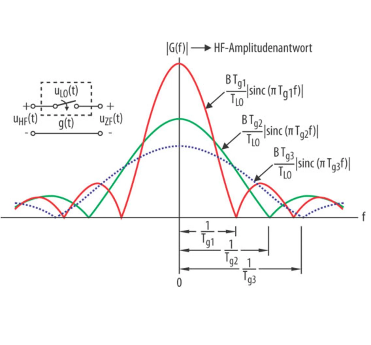 Aus Bild 2 ist zu entnehmen, dass die abgetastete Zwischenfrequenz-Wellenform UZF(t) das arithmetische Produkt der sinusförmigen HF-Wellenform UHF(t) und der Leitfähigkeit des idealen Schalters g(t) ist. Das heißt,