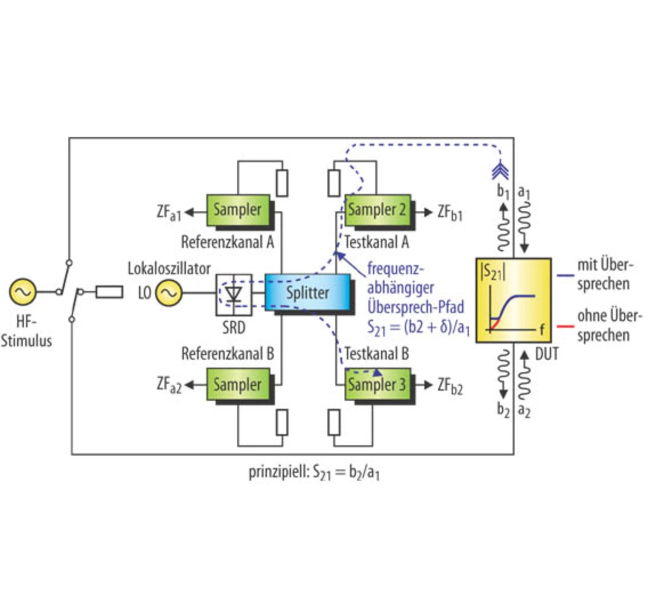 Das Phänomen des Übersprechens ist am besten zu verstehen, wenn man sich das SRD-gesteuerte Abtastreflektometer (2-Port-VNA) in Bild 4 betrachtet. Hierbei ist zu sehen, dass reflektierte Wellenanteile vom Messobjekt (DUT, ganz rechts) über den Sampler 2 (rechts oben), den Signalsplitter und die SRD-Pulsgenerierung (Bildmitte) in den Sampler 3 (unten rechts) überkoppeln.