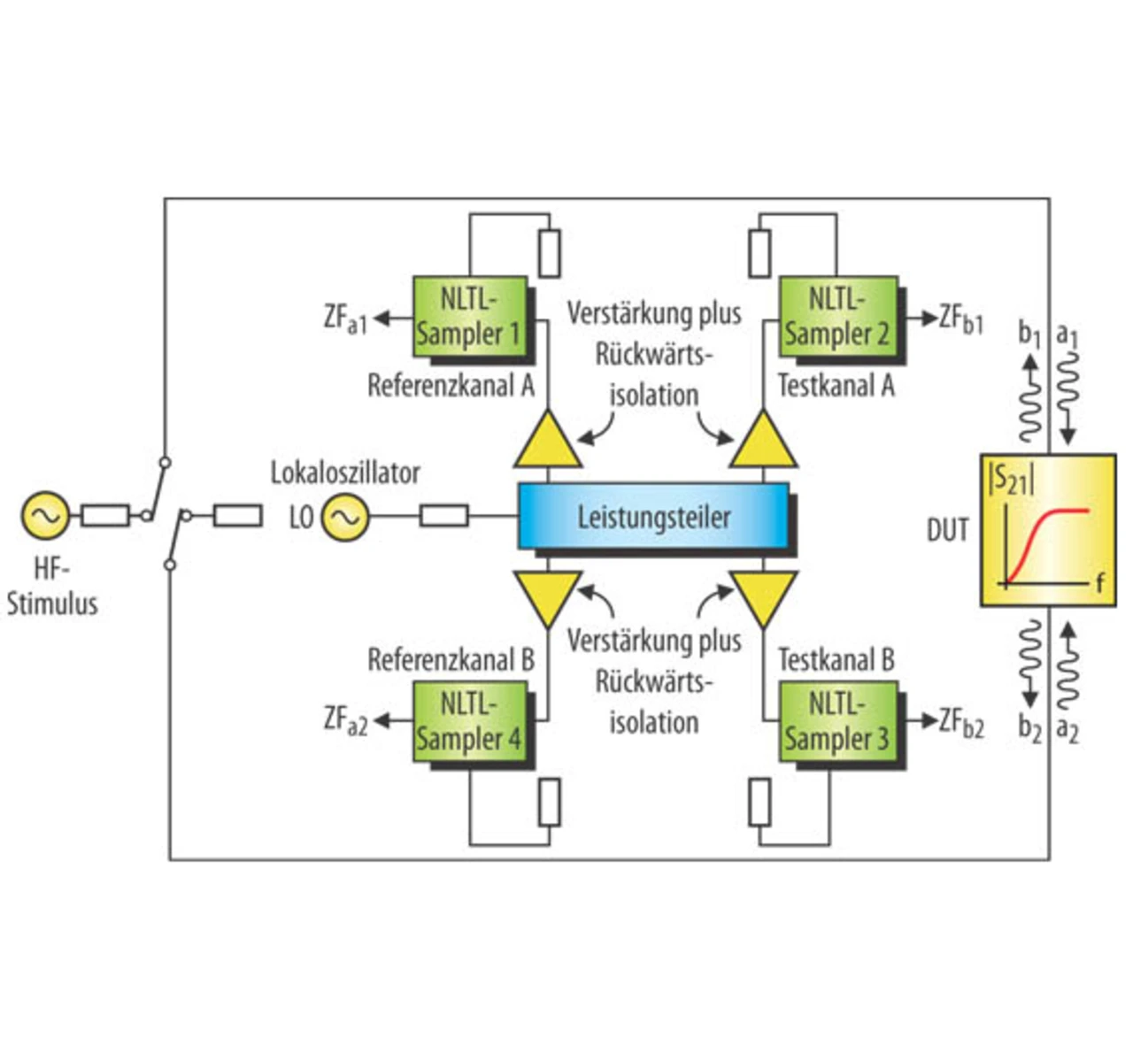 Wegen ihrer attraktiven Eigenschaften sind Sampler auf NLTL-Basis für die Anwendung in der VectorStar-VNA-Familie entwickelt worden. Zu diesen Eigenschaften gehören die HF- und LO-Frequenzskalierbarkeit und eine hohe Isolation zwischen den Kanälen, die Übersprechen verhindert. Dieses Übersprechen ist dabei der Schlüsselfaktor für einen hohen Dynamikbereich. Die in Bild 6 gezeigten Verstärkerbaugruppen vermeiden dabei durch ihre Rückwärtsübertragungsfunktion (S12) ein Übersprechen zwischen den verschiedenen Sampler-Baugruppen.