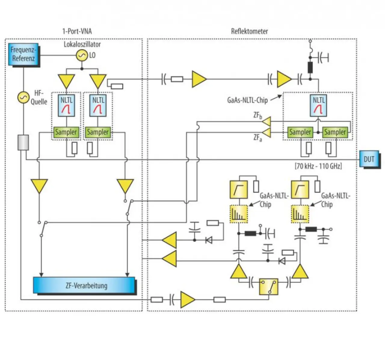 > Ein durchgehender DC- und HF-Pfad, der im Basis-VNA beginnt und zum DUT führt. Hierdurch kann vom Basis-VNA ausgehend ein Stimulussignal im Bereich von 70 kHz bis 54 GHz zum DUT geführt werden. Parallel kann durch Nutzung des externen Reflektometers zwischen 30 und 54 GHz die unkorrigierte Richtschärfe (Raw Directivity) des Basis-VNA verbessert werden. Der externe Reflektometerempfänger und der Kammgenerator für die Oberschwingungserzeugung werden für den Messbereich 54 bis 110 GHz genutzt.