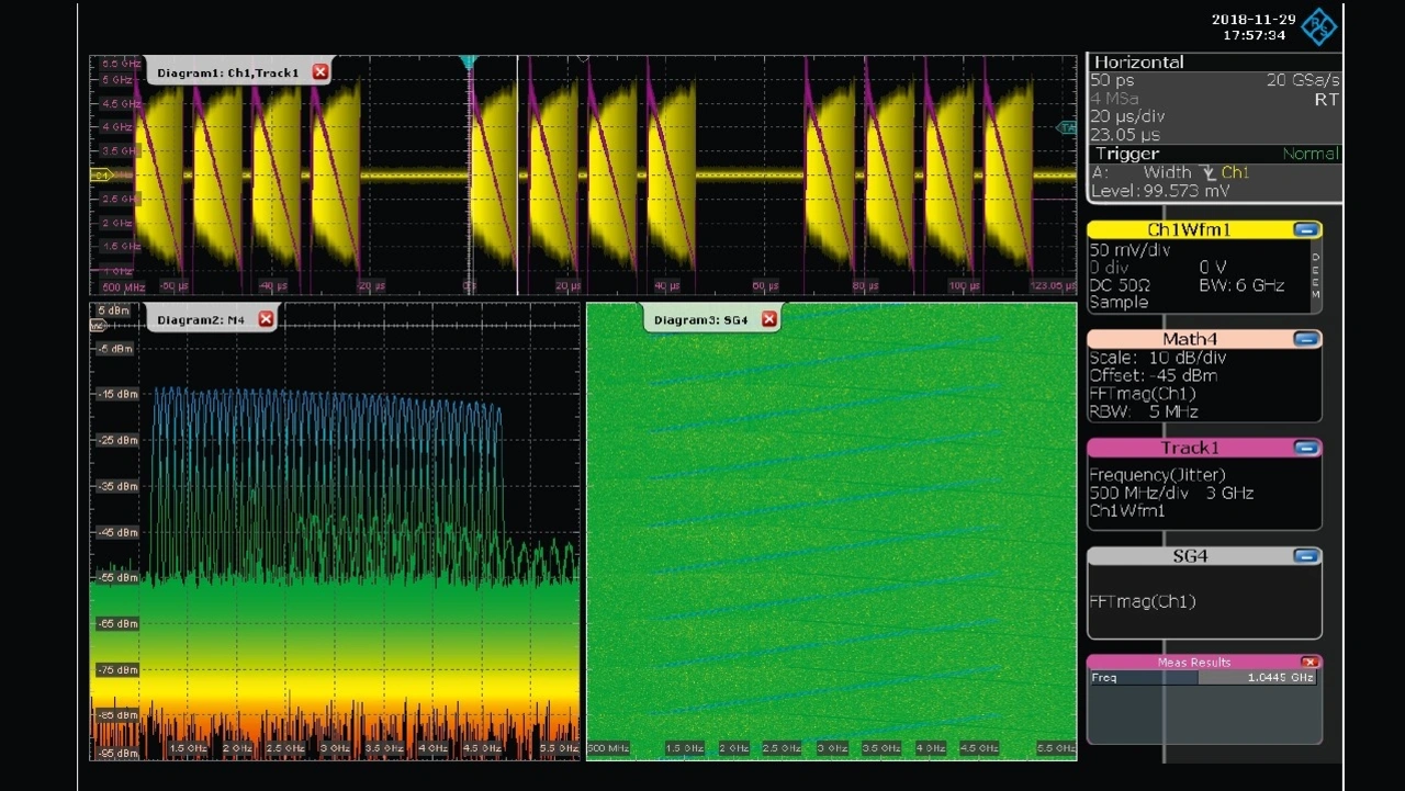 ...der maximalen Bandbreite des Oszilloskops nutzen – wie z. B. Automotive-Radare mit Frequenzen von 77 GHz bis 81 GHz oder das neue 60-GHz-Radar für die Gestenerkennung – wird die Signalerfassung mit externen Mischern durchgeführt. Ein Oszilloskop, das Echtzeit-Deembedding unterstützt, kann die durch die zusätzlichen Komponenten im Signalpfad verursachten Verluste kompensieren. Während Tools für grundlegende Analysen im Zeit- und Frequenzbereich oft bereits integriert sind (Abbildung 3), kann für eine tiefergehende Puls- und Transientenanalyse eine Speziallösung wie die R&S VSE Software erforderlich werden.