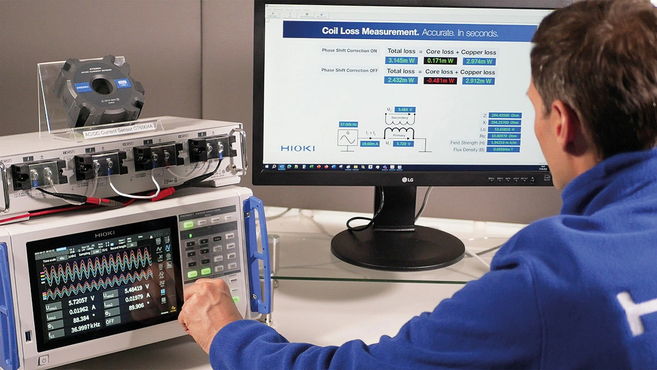 Der zunehmende Einsatz von SiC- und GaN-Bauelementen in Wechselrichtern führt zu immer höheren Schaltfrequenzen und kleineren, leichteren Wicklungen und Spulen. Für eine hochgenaue und schnelle Spulenverlustmessung auch bei hohen Frequenzen sorgen ein Leistungsanalysator und Stromsensoren von Hioki.