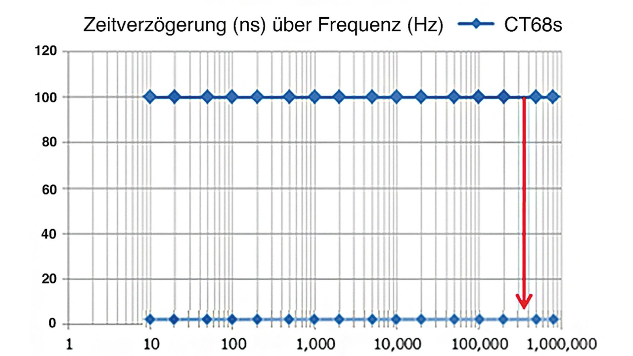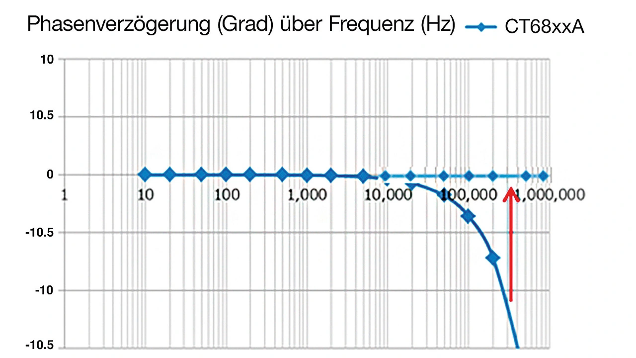 Der Phasenfehler steht in direktem Zusammenhang mit der Zeitverzögerung des Stromsensors. Für einen Stromsensor der Serie CT68xxA von Hioki ist die Verzögerung in Bild 7 dargestellt. Man sieht eine Zeitverzögerung in Nanosekunden in Abhängigkeit von der Frequenz.