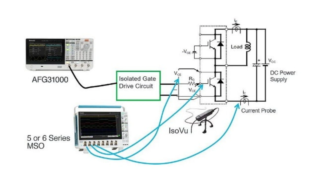 Zur Durchführung des Tests wird ein arbiträrer Funktionsgenerator (AFG) mit einem isolierten Gate-Treiber verbunden und muss dazu in der Lage sein, mindestens zwei Spannungsimpulse mit unterschiedlichen Impulsbreiten zu erzeugen. Wie beschrieben ist die erste Impulsbreite in der Regel länger und so eingestellt, dass der gewünschte Strom erreicht wird. Der zweite Impuls muss unabhängig vom ersten Impuls eingestellt werden und ist in der Regel kürzer als der erste Impuls, damit der Leistungsbaustein nicht thermisch zerstört wird.