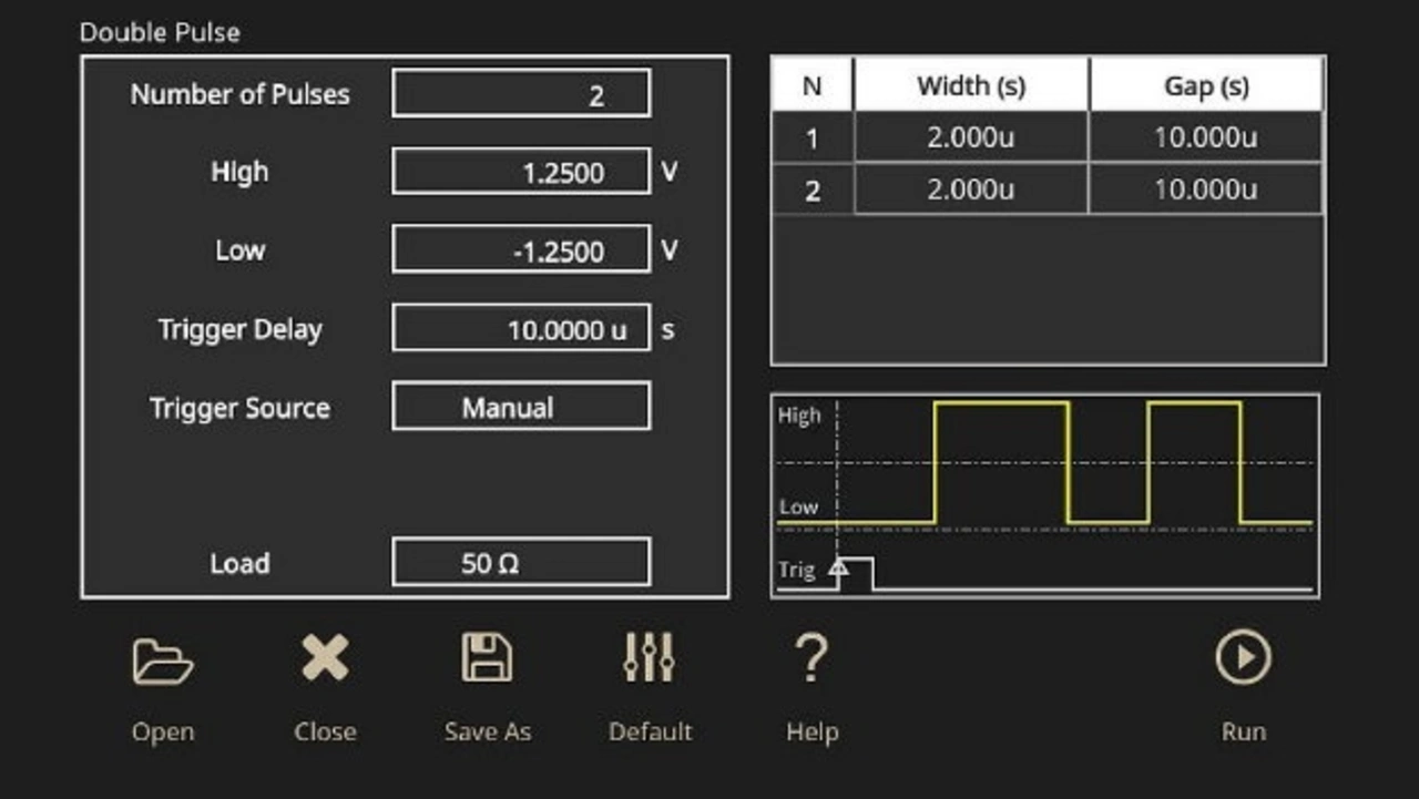 Obwohl es verschiedene Ansätze gibt, die Impulse manuell mit einem PC oder einem Mikrocontroller zu erzeugen, ist der AFG eine der einfachsten und zuverlässigsten Lösungen im Doppelpulstest. Eine solche Software, wie in Abbildung 9 dargestellt, ermöglicht dem Benutzer, eine Reihe von Parametern in einer einzigen Übersicht einzustellen.