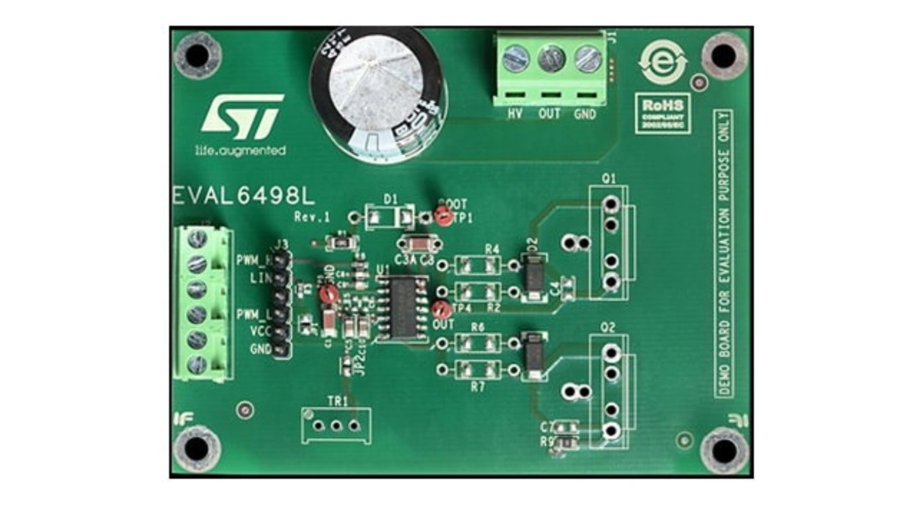 Um zu zeigen, wie ein Doppelpulstest funktioniert, haben wir uns ein ST Micro-Electronics Evaluation Board (EVAL6498L), wie in Abbildung 10 gezeigt, zusammen mit einem N-Kanal 600V MOSFET mit 7,5A Drainstrom, ebenfalls von ST Micro-Electronics (STFH10N60M2), zusammengestellt. Die Anschlüssen wurden wie folg verbunden.