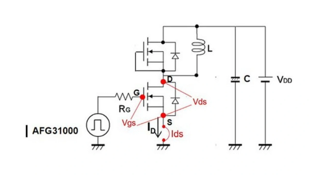 Nachdem alle elektrischen Anschlüsse sicher angeschlossen sind, schließen wir die Tastköpfe vom Oszilloskop an Q2 (Low-Side-MOSFET) an, wie in Abbildung 11 dargestellt. Da das VGS anfällig für Gleichtaktstörungen ist, haben wir einen Tastkopf mit einer hohen Gleichtaktunterdrückung gewählt. Eine Differentialtastkopf wurde an VDS angeschlossen und ein Stromtastkopf über eine Schleife an die Sourceleitung des MOSFETs angebracht.