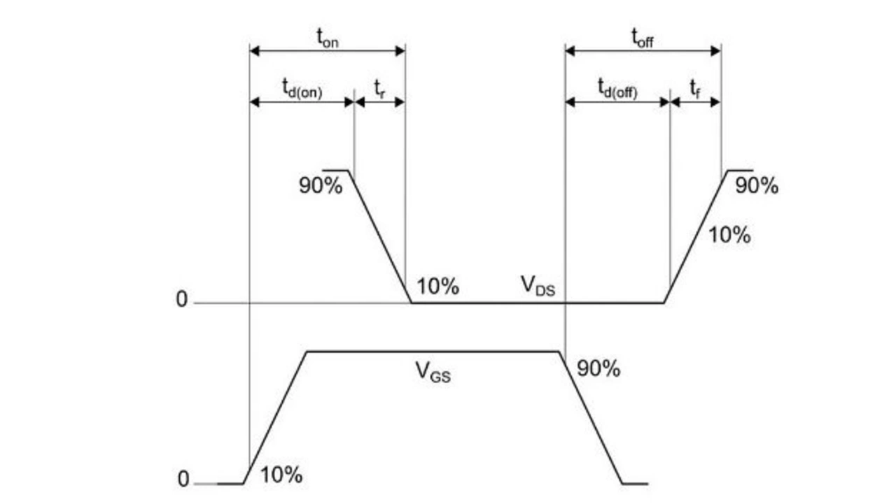 • td(off): Zeitintervall zwischen VGS bei 90% seiner Spitze und Vds bei 10% seiner Spitzenamplitude.