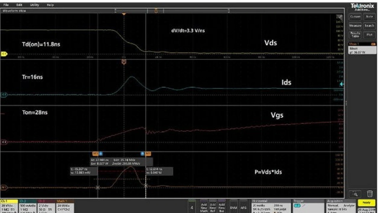 Wie wir sehen können, ähneln die Signalformen denen aus Abbildung 7. Der aktuelle Überschwinger, der auf Ids zu sehen ist, ist auf die Reverse-Recovery der Freilaufdiode aus dem High-Side MOSFET/IGBT zurückzuführen. Diese Spannungsspitze ist Teil des DUTs und trägt zu den Leistungsverlusten bei.