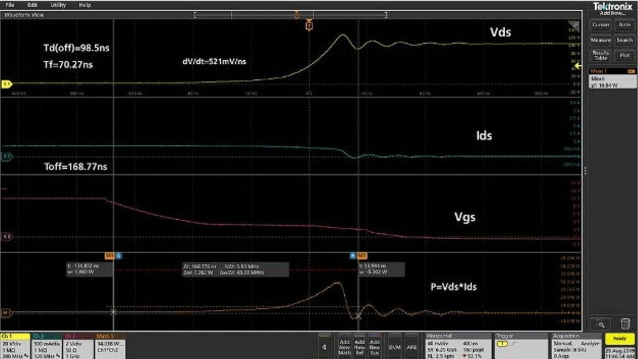 Wie beim Einschalten haben wir mit den Cursors die zeitlichen Ausschaltparameter, wie in Abbildung 15 dargestellt, ausgelesen und erneut in die Mathematikfunktion gegeben, um den Ausschaltverlust während des Übergangs zu berechnen. Wir haben auch die gleiche Gleichung von oben verwendet, um die Energieverluste während des Ausschaltübergangs zu berechnen.