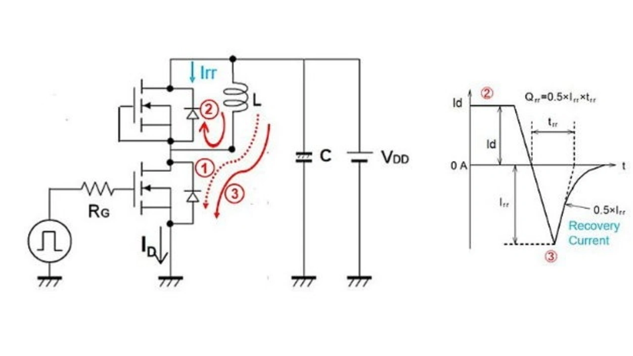 Der letzte Schritt im Testverfahren ist die Bestimmung der Sperrdiodencharakteristik des MOSFETs. Der Reversed-Recovery-Strom entsteht beim Einschalten des zweiten Impulses. Wie in Abbildung 16 dargestellt, leitet die Diode während Schritt 2 in einem Forward-Zustand. Da der Low-Side-MOSFET wieder eingeschaltet wird, möchte die Diode sofort in einen Reverse-Blockierzustand übergehen. Jedoch leitet die Diode für einen kurzen Zeitraum in einem Reverse-Zustand, der als Reverse-Recovery-Strom bezeichnet wird. Dieser Reverse-Recovery-Strom wird in Energieverluste umgewandelt, die sich direkt auf den Wirkungsgrad des Stromrichters auswirken.
