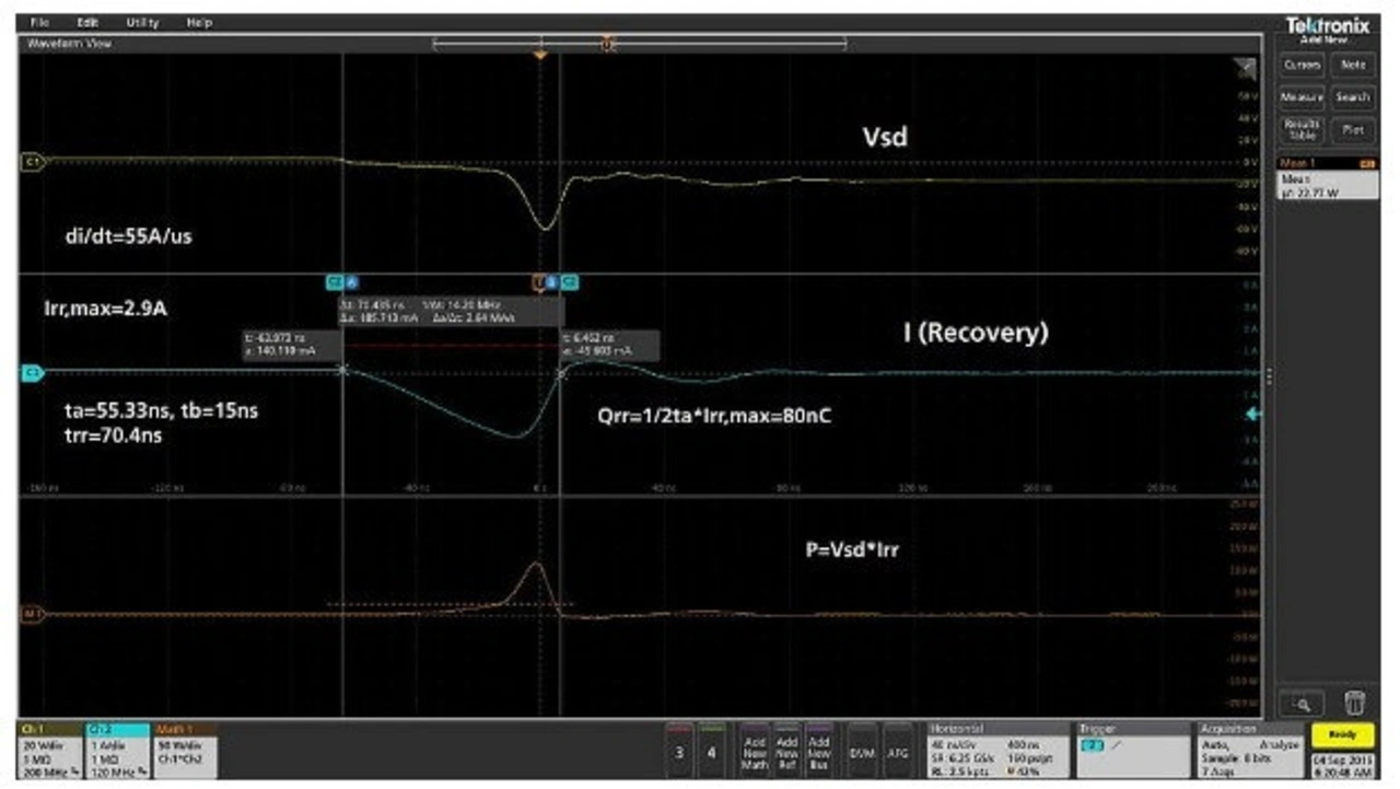 Die in Abbildung 17 dargestellten Signalformen wurden bei 20V aufgenommen, die von der SMU eingespeist werden. Mit den Cursors konnten wir die Timing-Parameter ablesen. Auch hier haben wir mithilfe der Mathematikfunktion den Energieverlust der Reverse-Recovery während dieses Übergangs berechnet. Die folgende Gleichung wurde zur Berechnung der Energieverluste während des Übergangs verwendet.