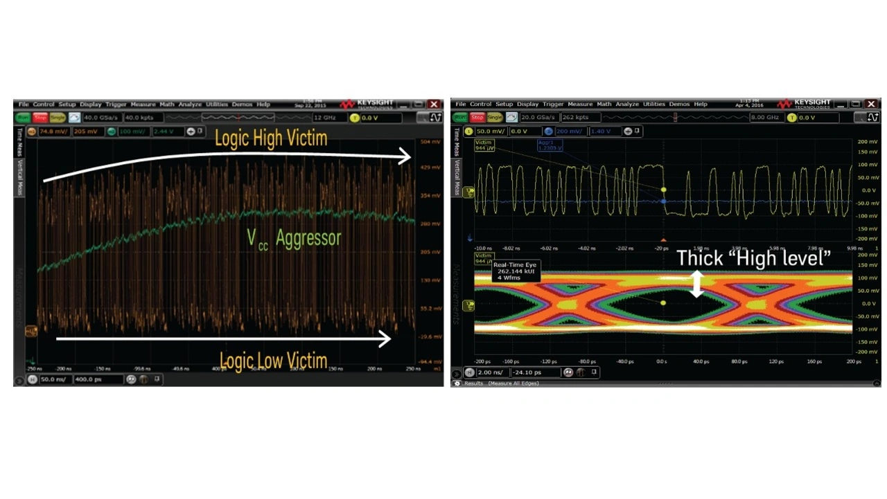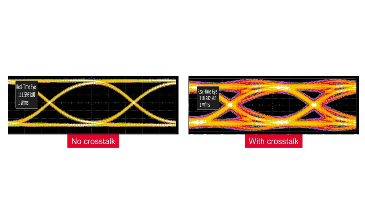 Anwender jedoch wollen ein sauberes Signal mit wenig oder gar keinem Nebensprechen, um ein weit offenes Augendiagramm zu erhalten und eine fehlerfreie Datenübertragung zu gewährleisten. Wenn Nebensprechen vorhanden ist, führt die Störung zu einer Verzerrung des Augendiagramms – was wiederum zu geringen Designmargen oder sogar zu Messfehlern führt, wie in Bild 1 dargestellt. Nebensprechen vermindert auch die vertikale und Jitter-Leistung des Opfersignals, was Interoperabilitätsprobleme in einer Kommunikationsverbindung verstärkt.