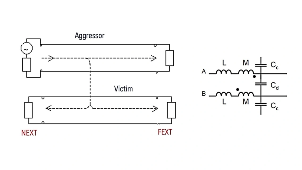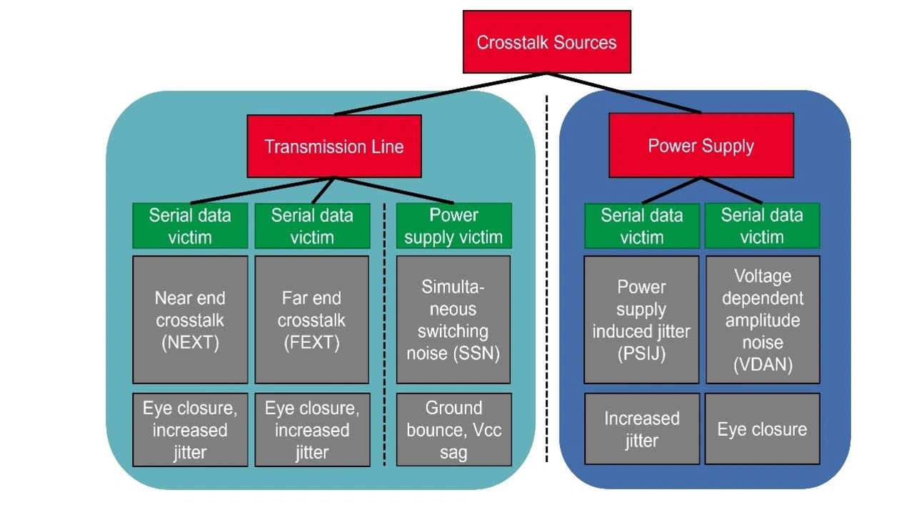 Schnellere Datenübertragungsraten und mehr Lanes auf einer kleineren Schaltungsfläche finden sich in Designs wie den 100G-Standards mit vier parallelen 25 Gb/s-Leitungen und ASICs mit Hunderten von SerDes. Das hat zu einer Zunahme des Nebensprechens in Designs geführt. Elektromagnetische Interferenzen zwischen Schaltungskomponenten, die sich in unmittelbarer Nähe befinden, können ein Nebensprechen der Übertragungsleitungen verursachen. Übertragungsleitungen, die parallel zueinander verlaufen, können aufgrund ihrer kombinierten Induktivität und Kapazität, die die Energie eines Signals in das andere einkoppeln, ein Nebensprechen verursachen.