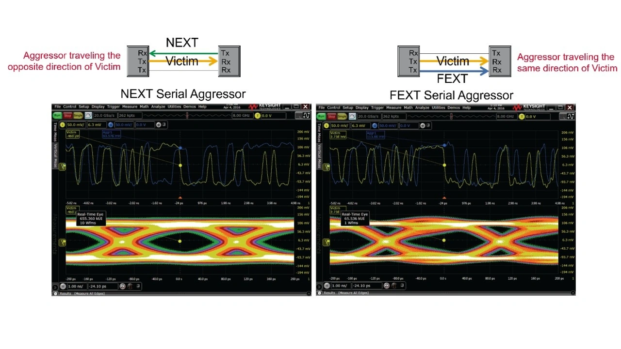 Ingenieure messen seit Jahren das Nebensprechen in digitalen Kommunikationssystemen, indem sie selektiv einige Kanäle deaktivieren und andere aktivieren und die Ergebnisse der Augendiagramme vergleichen. Ingenieure müssen die Nebensprech-Effekte im System messen, während sie in speziellen Testmodi arbeiten. Diese Methode ist nicht ideal, da sie nicht den tatsächlichen Betrieb des Entwurfs widerspiegelt. Gleichzeitig ist sie nur teilweise funktionsfähig, und häufig können Designs nicht in diesem speziellen Modus betrieben werden. Wenn ein Design ein geschlossenes Auge aufweist, müssen die Ingenieure manuell bestimmen, welcher Schaltkreis die Ursache für das Nebensprechen ist, und ihn entfernen.