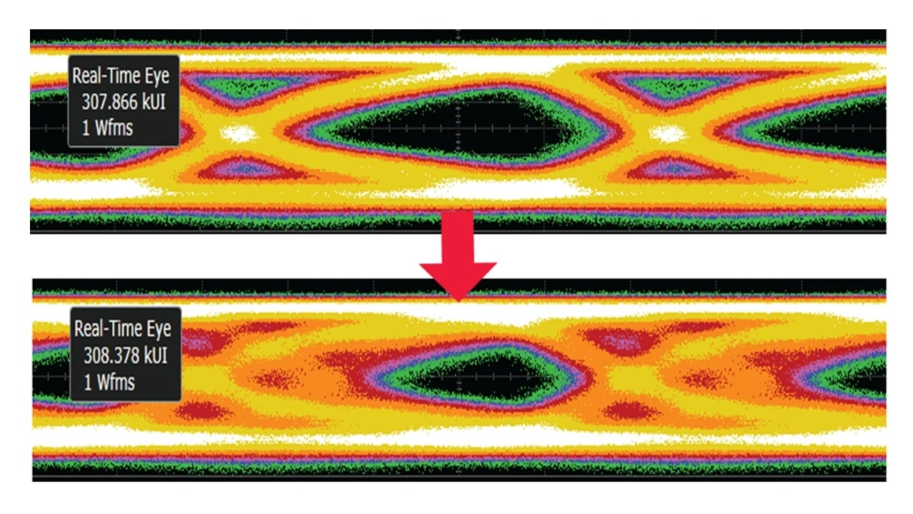 Die Übertragungsleitung kann sich auf die serielle Datenleitung und die Stromversorgung in einem Geräte-Design auswirken und verschiedene Arten von Augenverzerrungen verursachen. Störungen der Stromversorgung auf der übertragenen seriellen Datenleitung können zu Rauschen und Jitter führen.
