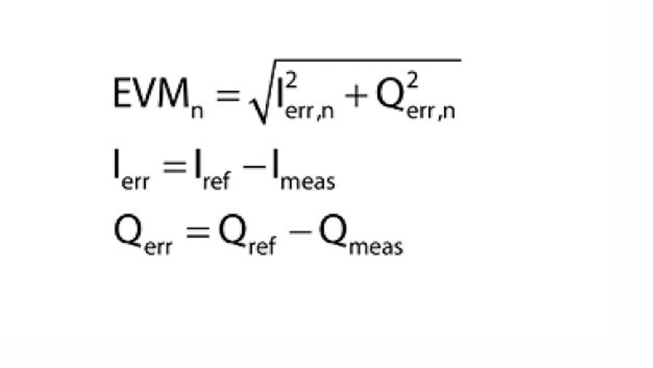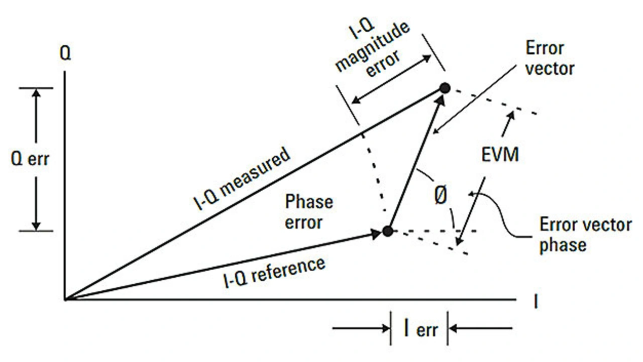 Die Kommunikationssystembranche betrachtet den Wert der EVM (Error Vector Magnitude) als Maßstab für die bandinterne Verzerrung. Die EVM ist definiert als der quadratische Mittelwert (RMS) des Fehlervektors über die Zeit an den Stellen n der Symboltaktübergänge. Der Fehlervektor ist die Vektordifferenz zwischen dem idealen Referenzsignal und dem gemessenen Signal zu einem bestimmten Zeitpunkt (Bild 3) (Formel).