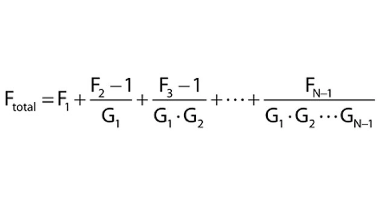 Der Rauschfaktor der ersten Stufe F1 bestimmt die minimale Rauschzahl für den Gesamtempfänger (Friis Formel):