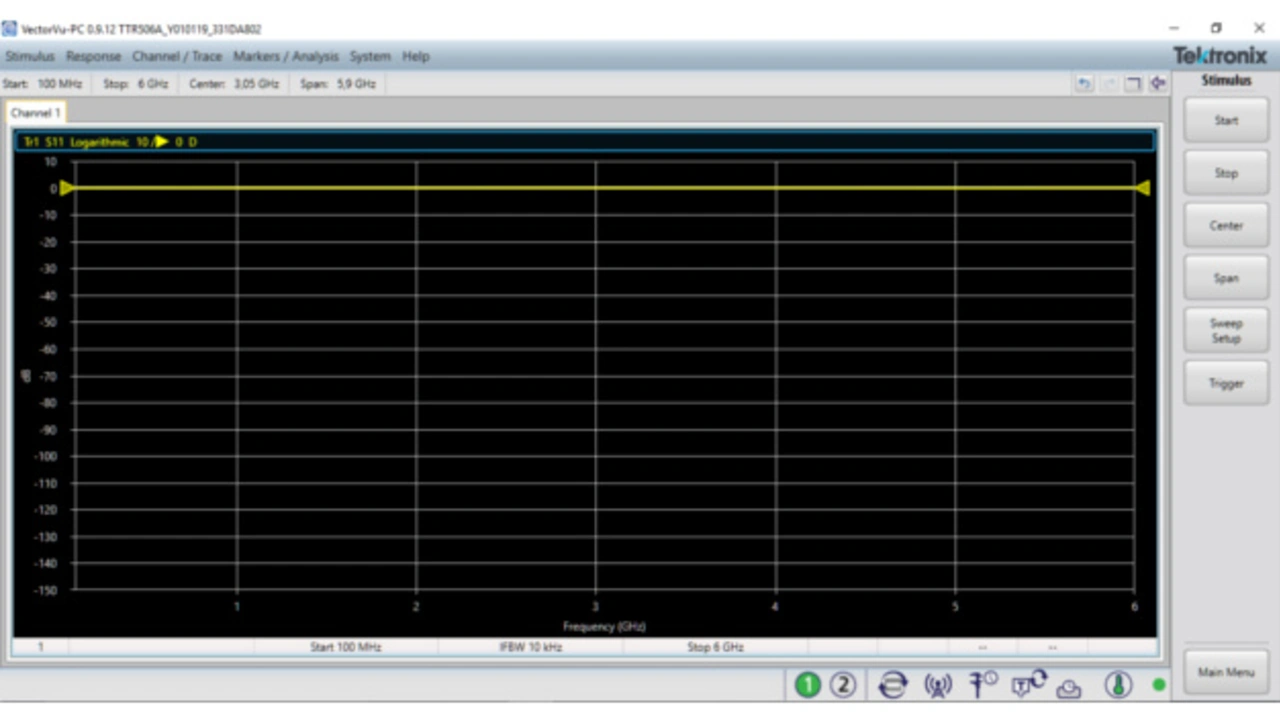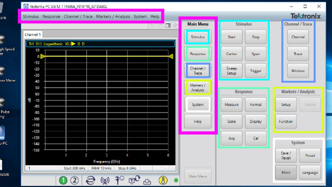 Die Hauptrubriken trennen Signalgeber "Stimulus" von Messaufnahme "Response", das Mess-Interface wird mit "Channel/Trace" angepasst. "Markers/Analysis" beinhaltet Auswertetools, "System" weitere Einstellungen und Speicheroptionen.