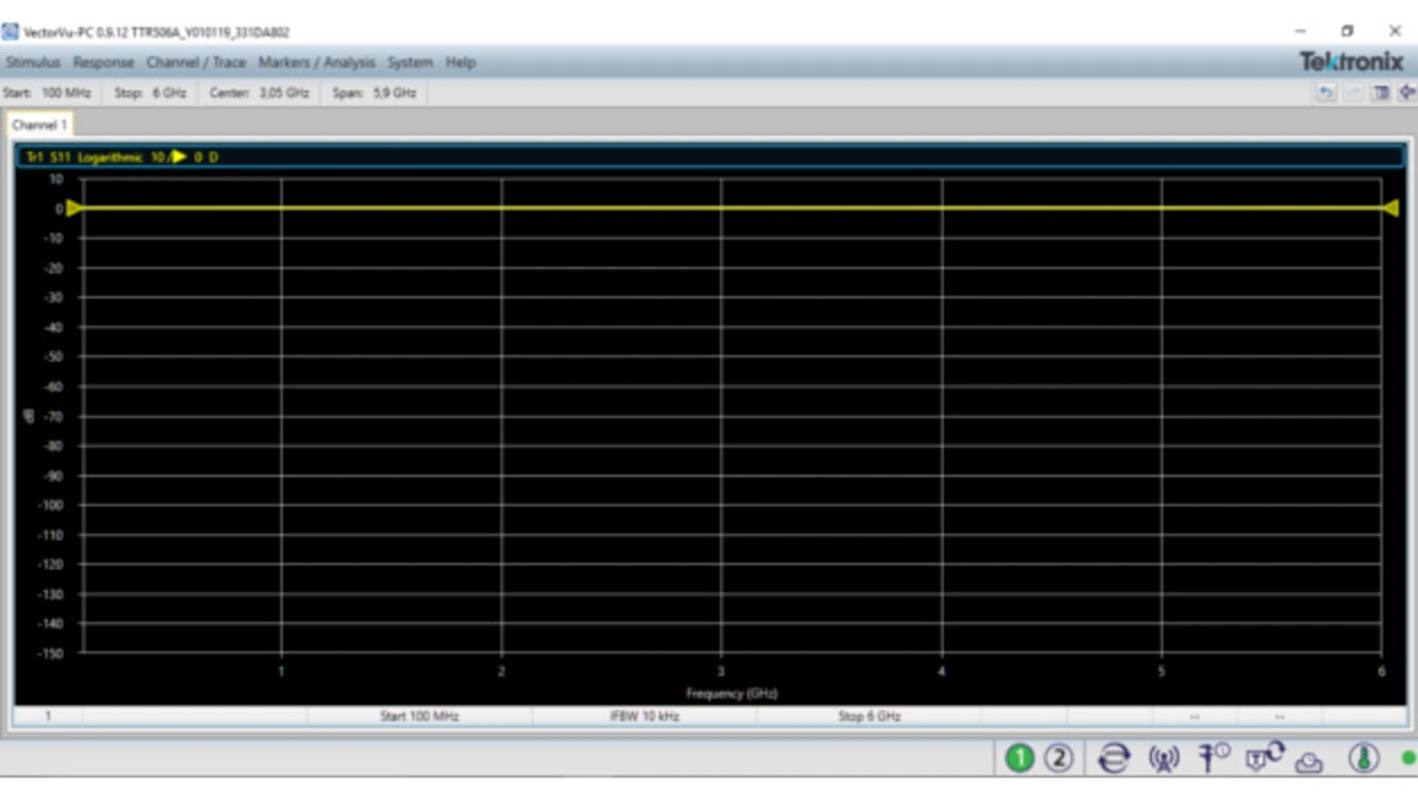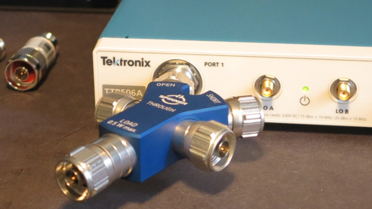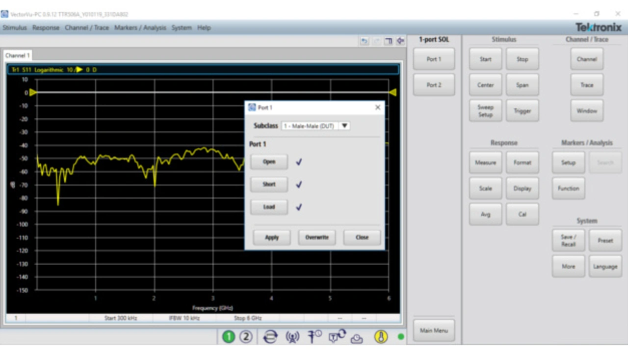 Reponse: Die Response-Sektion beinhaltet die Kalibrierungsroutine Cal. Am BN533884-Prüfling erfolgt die Open/Short/Load-Kalibrierung für Ein- wie Zwei-Port Messung.