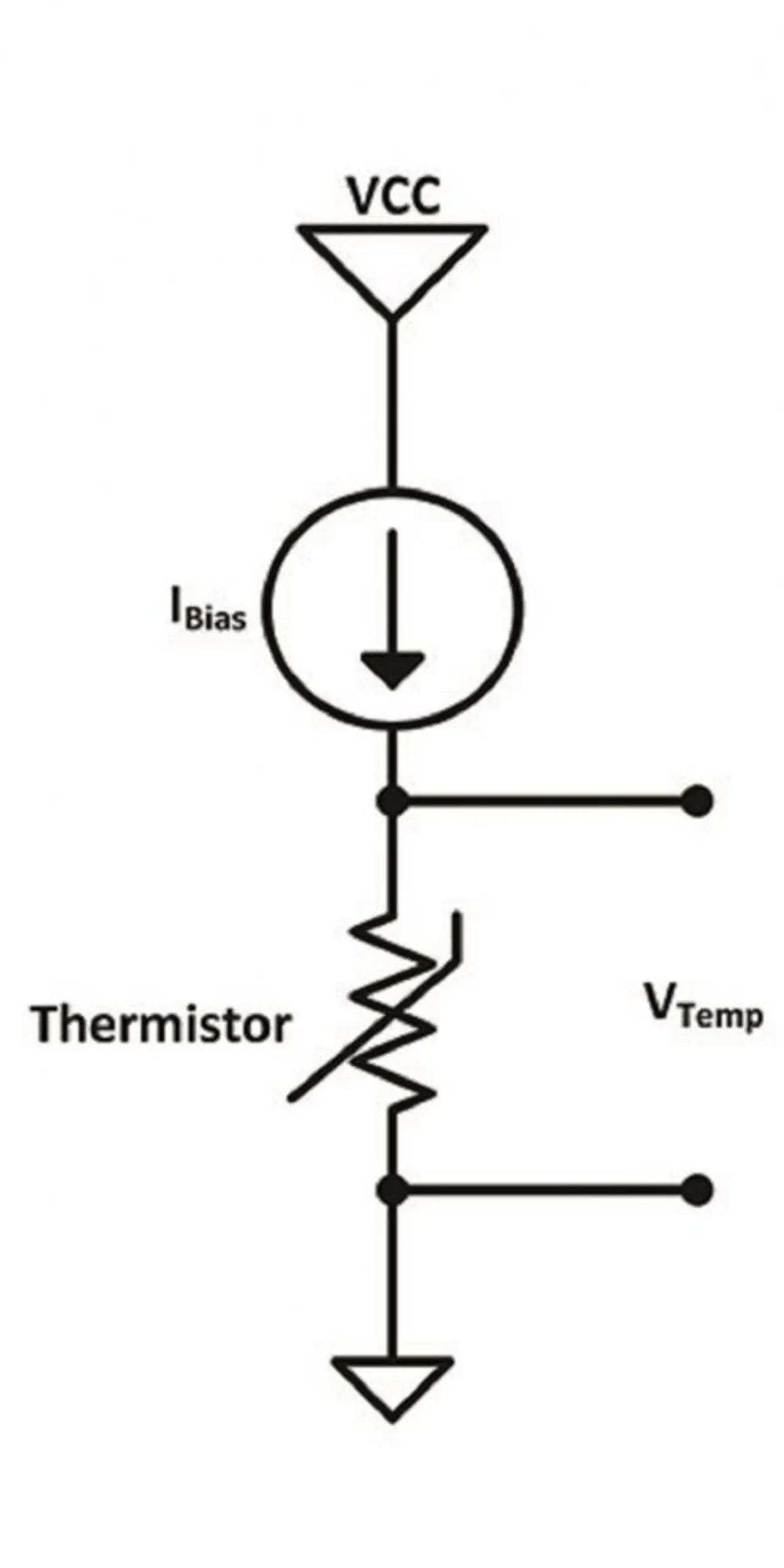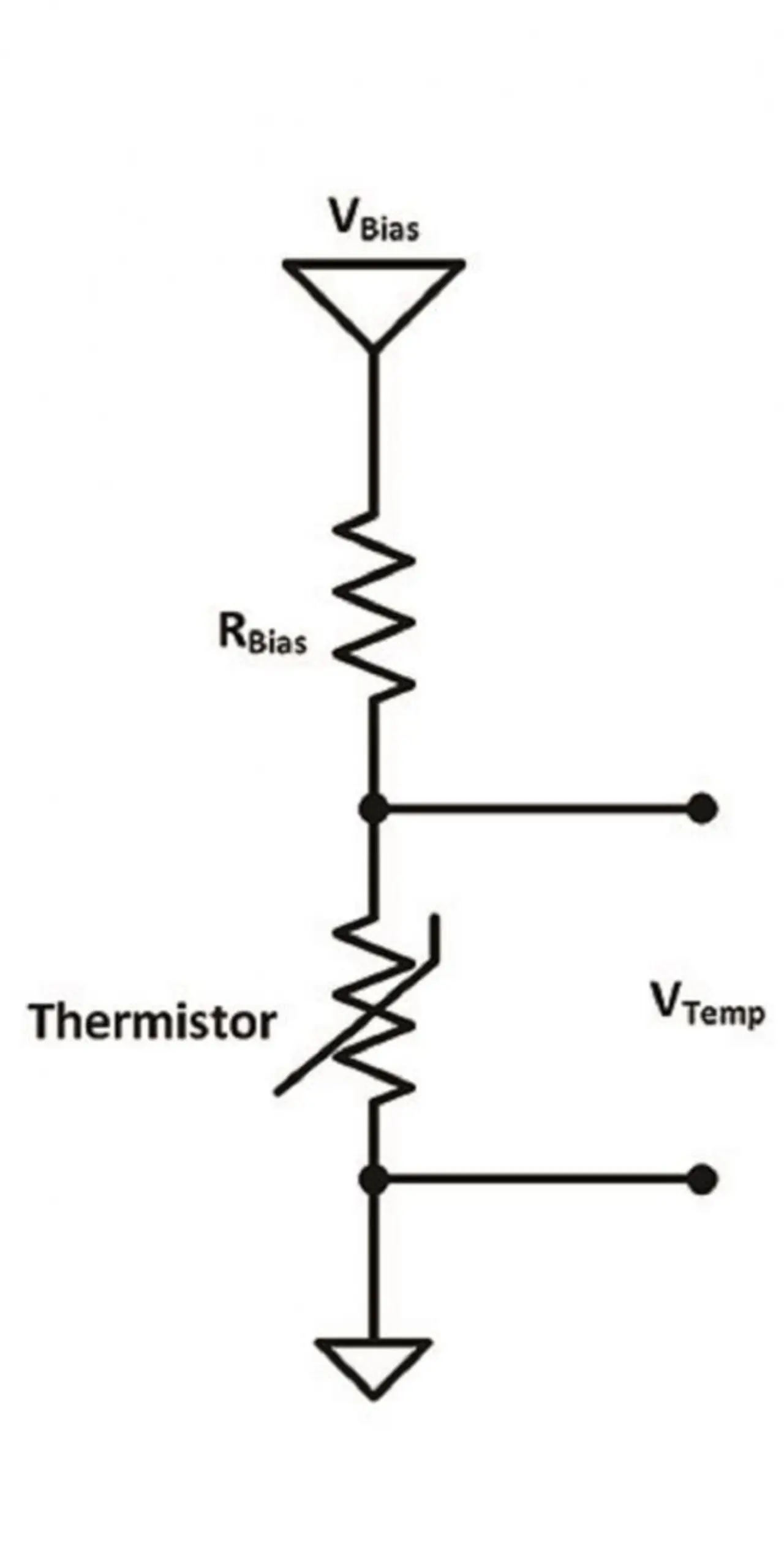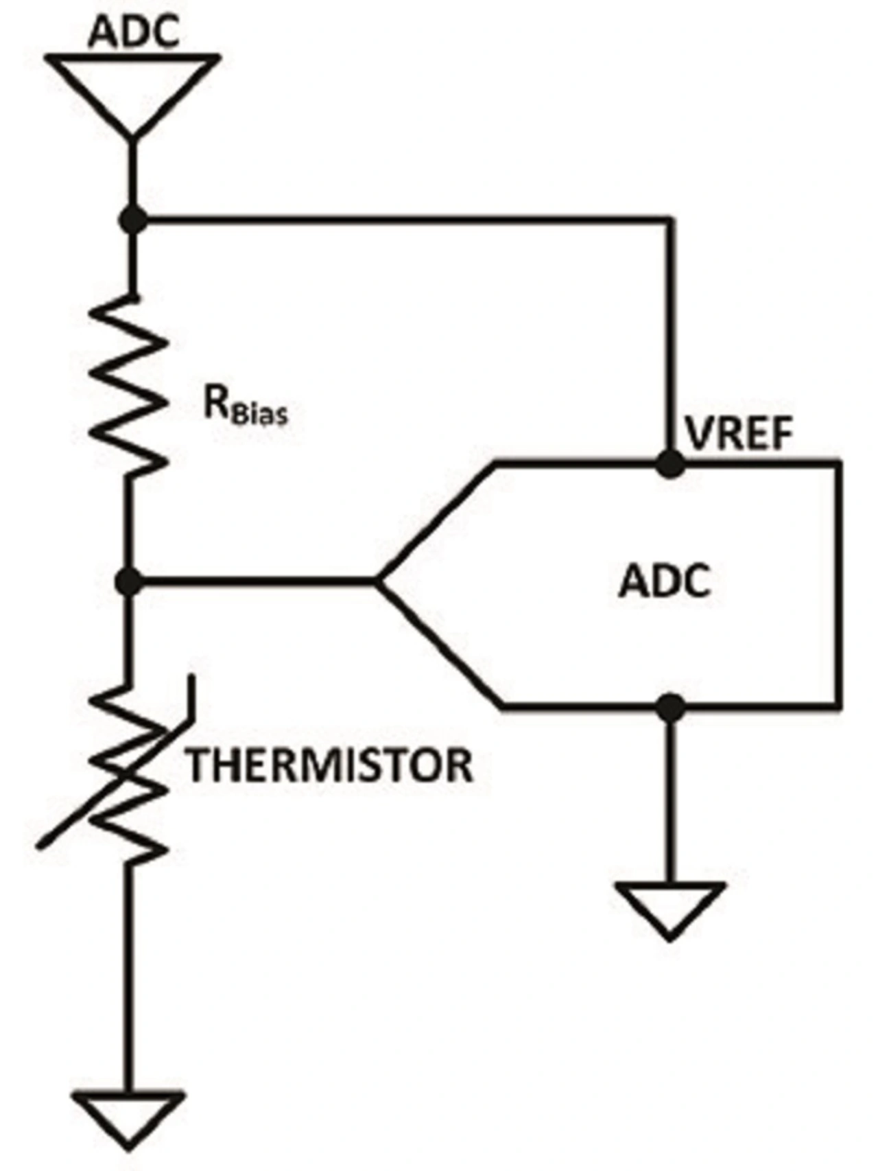 Häufig wird fälschlicherweise die Auffassung vertreten, NTC- und PTC-Thermistoren seien von der gleichen Art. Der NTC-Thermistor ist jedoch ein resistiver Baustein, dessen Widerstand sich abhängig von der Temperatur ändert. Für den praktischen Einsatz wird eine geregelte Spannung an eine Serienschaltung aus dem NTC-Thermistor und einem Widerstand gelegt (Bild 1). Ändert sich die Temperatur, so verändert sich der Widerstand des Thermistors und damit auch der Spannungsabfall an RBias. Die am Mittelpunkt des Widerstandsteilers anliegende analoge Spannung wird einem ADC zugeführt.