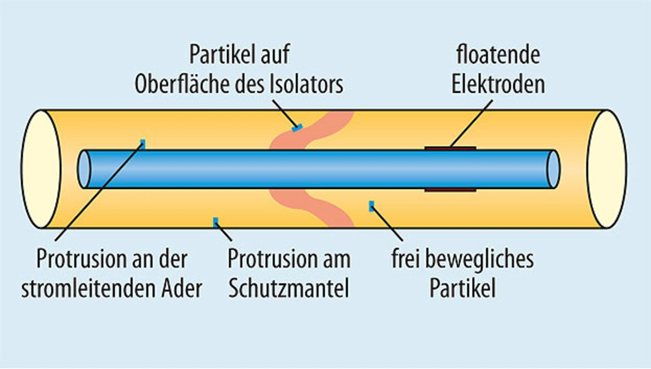 Beispielsweise sollte bei einer Spannung von 20 kV und einer isolierenden Schicht von 50 mm eine durchschnittliche Isolation von 400 V/mm durch das Dielektrikum erzielt werden, um das Kabel nach außen elektrisch neutral zu gestalten. Verschiedene Faktoren (Bild 2) können dazu führen, dass die Isolation abnimmt und es zu einer Teilentladung kommt: