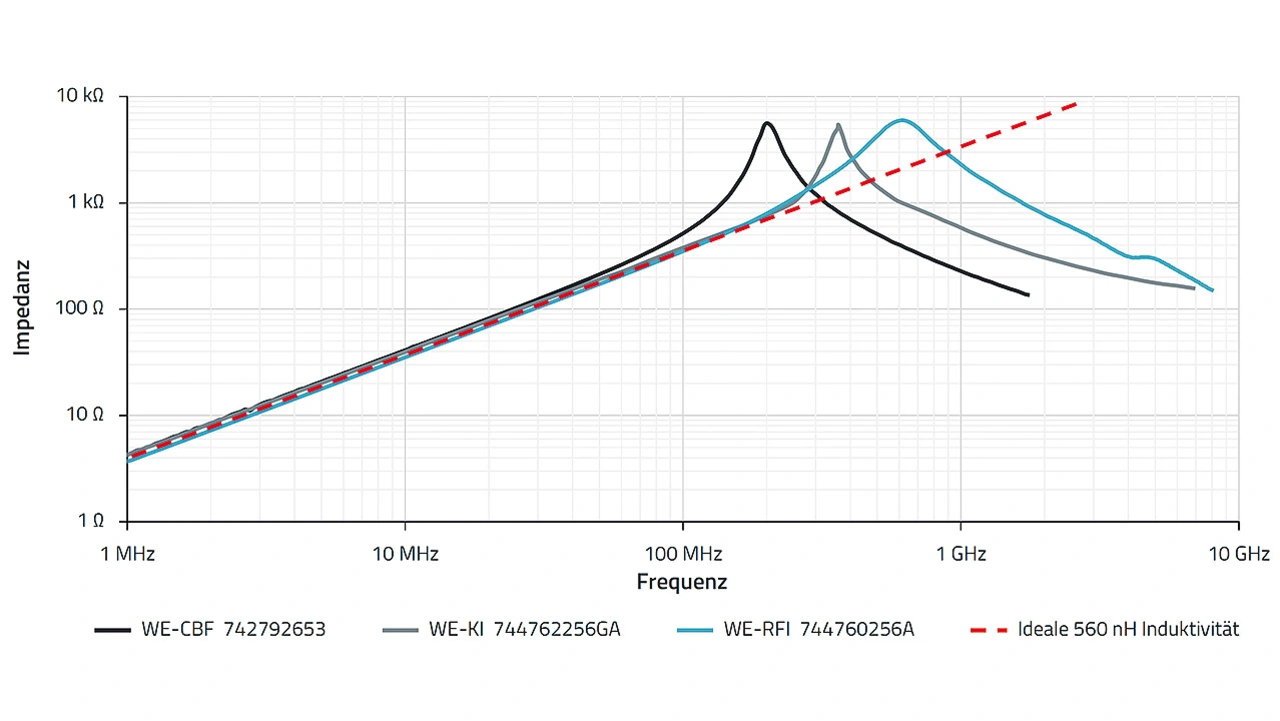 Die Komponenten wurden so gewählt, dass sie im Bereich unter ihren Impedanzmaxima einen ähnlichen Impedanzverlauf aufweisen. Die Unterschiede der Impedanzen zeigen sich im Bereich der Maxima; der SMT-Ferrit hat sein Maximum bei der niedrigsten Frequenz, der drahtbewickelte Ferrit bei der höchsten. Die Keramik-Induktivität hat im Bereich des Impedanzmaximums den steilsten Anstieg und Abfall und somit die höchste Güte Q.