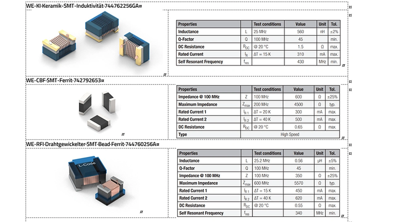 Bei Induktivitäten mit Ferritkern (WE-RFI) und bei SMT- Ferriten (WE-CBF) ist im Datenblatt nicht ein Induktivitätswert, sondern eine Impedanz bei einer Messfrequenz angegeben. Es zeigt sich auch, dass der SMT-Ferrit die höchste Toleranz hat; die Induktivität ohne Ferrit hat die geringste Toleranz.