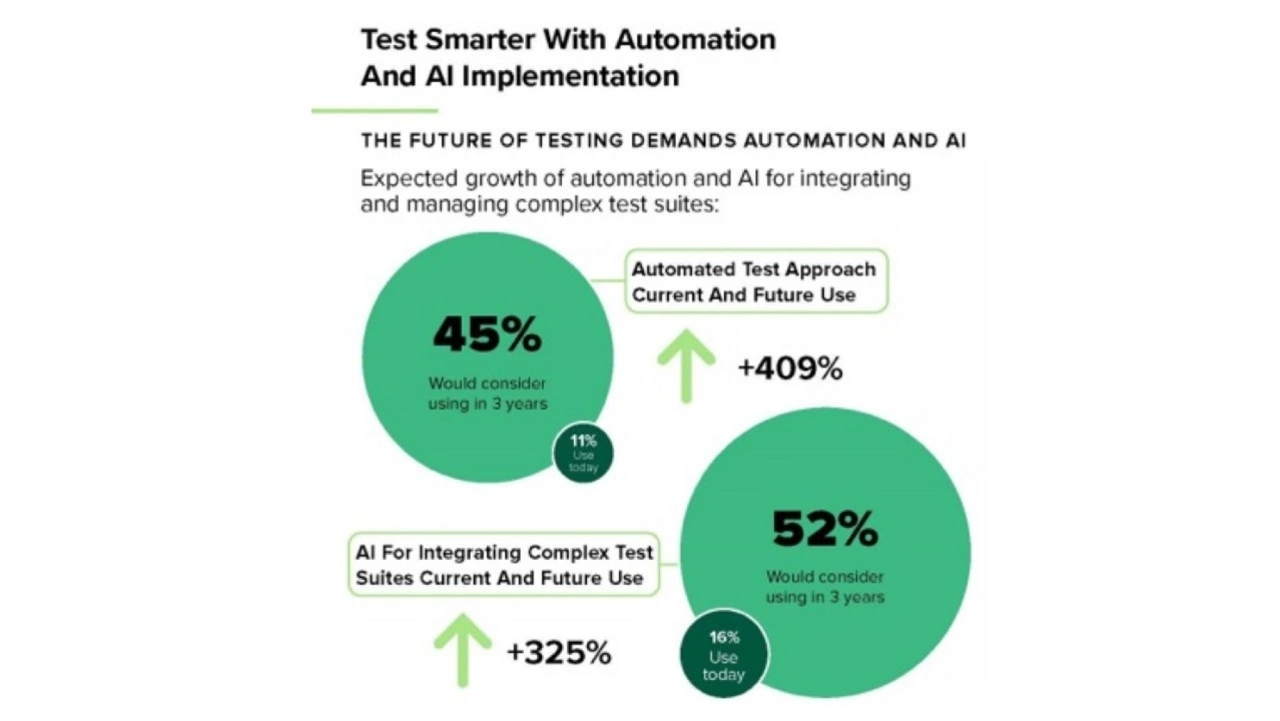 Dennoch erkennen Unternehmen, dass manuelle und teilautomatisierte Teststrategien nicht mit der zunehmenden Komplexität der Produkte Schritt halten können. Infolgedessen ziehen 45 % in den nächsten drei Jahren einen vollautomatischen Ansatz in Erwägung, was einem Zuwachs von 409 % entspricht. Mehr als die Hälfte (52 %) gab an, dass sie KI für die Integration komplexer Testsuiten in Betracht ziehen würden, was einem Zuwachs von 325 % entspricht.