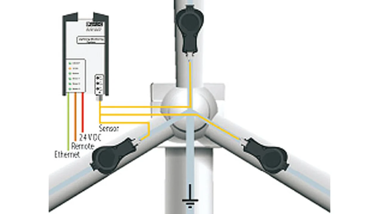 Auf den Blitzstromableitungen der Windflügel ist jeweils ein Sensor montiert. Die Auswerteeinheit befindet sich in einem Steuerschrank in der Nabe. Die Signalverbindung zwischen den Sensoren und der Auswerteeinheit erfolgt mit Lichtwellenleitern. Die Ethernet-Verbindung zur zentralen Steuerung wird über Schleifringe zwischen Gondel und Kanzel hergestellt. Die Auswerteeinheit arbeitet mit 24 V Gleichspannung. Bei Bedarf wird der Remote-Kontakt an die Steuerung angeschlossen. Darüber lässt sich zusätzlich jeder Blitzeinschlag signalisieren oder die Anzahl der Ereignisse auswerten.