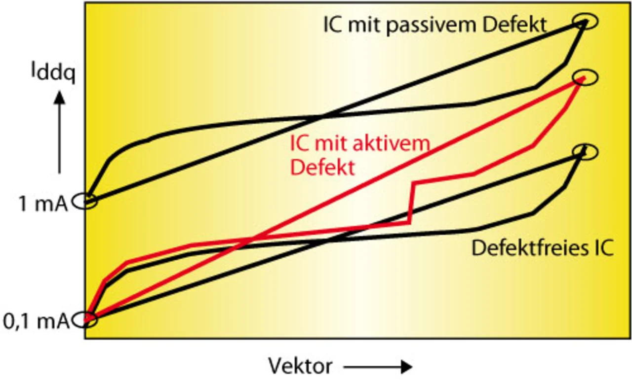 Beim Wafer-Test ist es sinnvoll, die Iddq-Kurven von benachbarten ICs zu vergleichen, denn diese sind ja (fast) den gleichen Prozessbedingungen ausgesetzt, so dass (fast) die gleichen Iddq-Eigenschaften zu erwarten sind. Leider ist damit diese Messmethode auf den Wafer-Test beschränkt; sie erfordert zudem einen recht hohen Aufwand: Zunächst müssen alle Iddq-Werte eines Wafers gemessen und gespeichert werden, um dann verarbeitet zu werden.