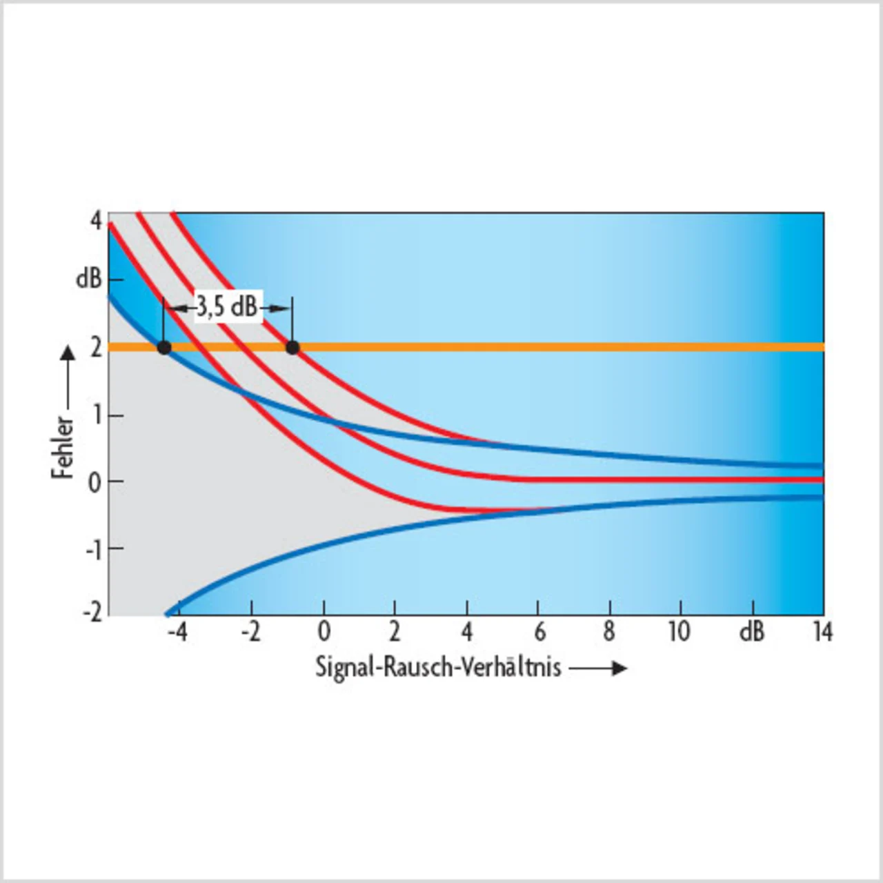 Bild 3 zeigt die Wirkung von NFE auf das 95-%-Intervall der Amplitudengenauigkeit bei Mittelung über viele Messwerte. Bei Messungen ohne NFE setzt man logarithmische Mittelung ein, weil sie den mittleren Fehler bei der Messung von Dauerstrichsignalen bei Überlagerung von Rauschen verringert. Mit NFE setzt man lineare Mittelwertbildung ein, weil der mittlere Fehler mit NFE 0 ist und die Mittelwertbildung eine geringere Varianz ergibt. Man kann erkennen, dass der Signalpegel, den man mit einer Unsicherheit von ±2 dB messen kann, mit NFE um etwa 3,5 dB tiefer liegt als ohne. Bildet man den Mittelwert über noch mehr Messwerte, ist die Verbesserung noch größer. Am Ende des Artikels ist hierfür ein extremes Beispiel angegeben.