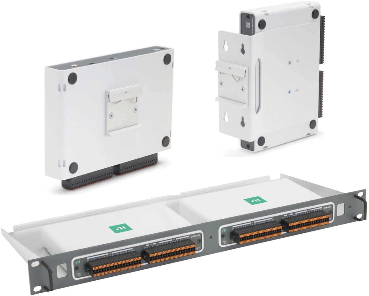 mioDAQ USB ist mehr als ein Desktop-Gerät. Der Benutzer hat die Wahl zwischen vertikaler oder horizontaler DIN-Schienen-, Flachpanel- und 19-Zoll-Rack-Montage für den Aufbau von Prüfständen und Automatisierungssystemen. Die Montagekits kommen mit USB-C-Kabeln mit rechtwinkligen Steckern, um die Installation zu vervollständigen. Ersatz-USB-C-Stecker sind ebenfalls erhältlich. Zu den Montagespezifikationen gehören (Bild 3):