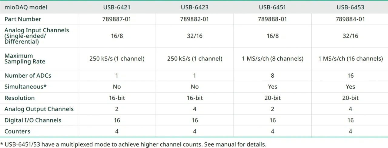 Einige mioDAQ-Geräte unterstützen Multiplexing, um eine höhere Kanalzahl zu erreichen. Im Multiplex-Modus wird ein einziger Analog/Digital-Wandler für mehrere analoge Eingangskanäle verwendet. Dadurch erhöht sich zwar die Anzahl der Kanäle, doch muss die Gesamtabtastrate von den gemultiplexten Kanälen gemeinsam genutzt werden, wodurch sich die Abtastrate der einzelnen Kanäle verringert. Außerdem lassen sich Steuersignale für eine Vielzahl von Funktionen automatisieren (Tabelle 1).