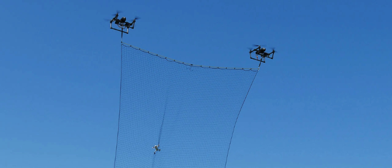 Wenn die gegnerische Drohne tatsächlich im Netz zappelt, können dann nicht alle drei mitsamt dem Netz abstürzen?
