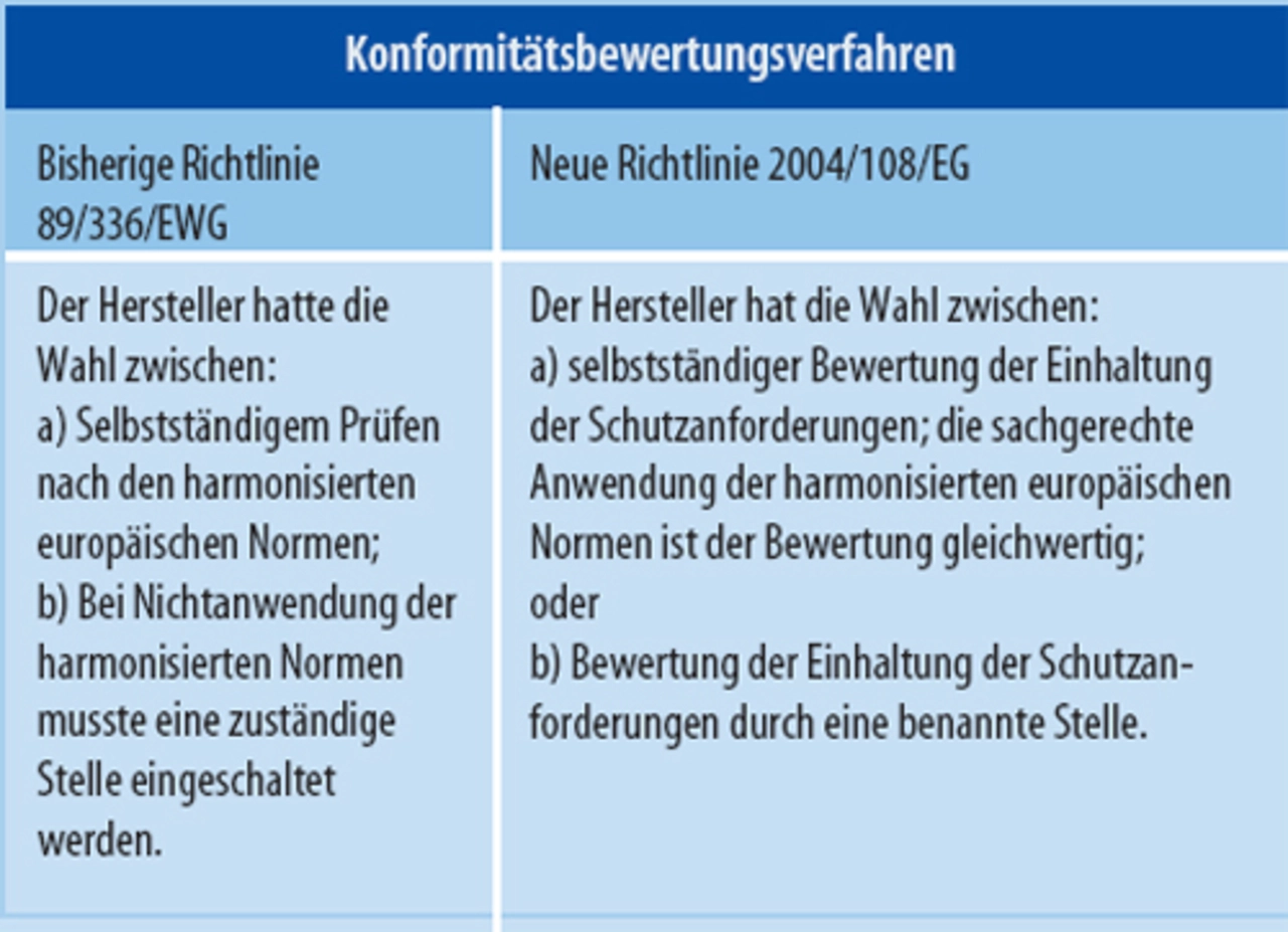 Die benannte Stelle bewertet, ob in diesen Unterlagen in angemessener Weise nachgewiesen wird, dass die Schutzanforderungen der Richtlinie eingehalten werden. Als Resultat dieser Bewertung erstellt die benannte Stelle im positiven Fall eine Erklärung, worin sie dem Hersteller die Übereinstimmung des Produkts mit den Anforderungen der Richtlinie bestätigt (Tabelle 3). Neu im Konformitätsbewertungsverfahren selbst ist, dass bei der Bewertung der elektromagnetischen Verträglichkeit alle bei bestimmungsgemäßem Betrieb üblichen Betriebsbedingungen zu berücksichtigen sind. Kann ein Gerät in verschiedenen Konfigurationen betrieben werden, so muss die Bewertung der elektromagnetischen Verträglichkeit bestätigen, dass die Schutzanforderungen in allen Konfigurationen eingehalten werden. Das bedeutet, dass bei konsequenter Handlung ein erhöhter Prüfaufwand entsteht, weil das Gerät in den entsprechenden Konfigurationen geprüft wird. Auch in diesem Fall kann der Hersteller auf freiwilliger Basis seine Unterlagen einer benannten Stelle zur Konformitätsbewertung vorlegen.