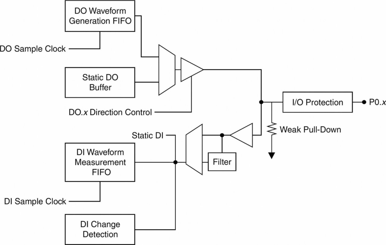 Alle diese Leitungen akzeptieren logische High-Pegel zwischen 2,2 und 5,25 V und logische Low-Pegel von 0 bis 0,8 V. Die digitalen Leitungen werden mit bis zu 10 MHz getaktet. Auf jeder digitalen Leitung befindet sich ein digitales Filter, das zur Entprellung der digitalen Eingangssignale dient. Es gibt drei Filtereinstellungen, die auf der verwendeten Filtertaktfrequenz basieren: kurz, mittel oder hoch. Die kurze Einstellung garantiert, dass eine Impulsbreite von mehr als 160 ns durchgelassen wird, die mittlere Einstellung lässt Impulsbreiten von 10,24 μs oder mehr durch, und die hohe Einstellung lässt Impulsbreiten von 5,12 ms oder mehr durch. Impulse, die schmaler sind als die Hälfte der durchgelassenen Impulsbreite, werden garantiert unterdrückt.