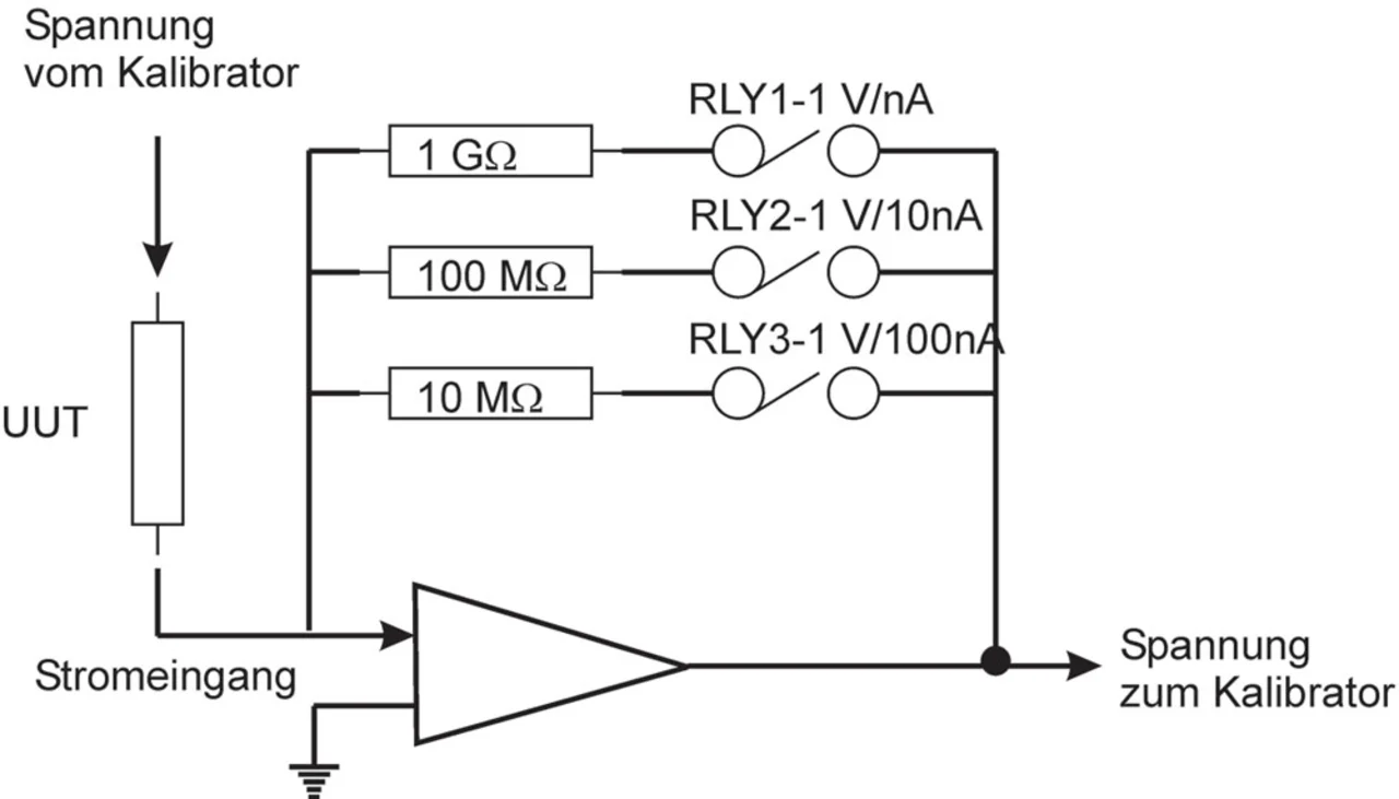 Daraus lässt sich leicht erkennen, dass zum Bestimmen hoher elektrischer Widerstände nichts anderes nötig ist als eine exakte Hochspannungsquelle, ein Mittel zum Messen von niedrigen Strömen sowie ein bisschen Rechenleistung. Eine exakte Hochspannungsquelle ist bereits im Kalibrator vorhanden, die Rechenleistung liefert ein PC – fehlt also nur noch die Hardware für die Strommessung. Die erforderlichen Strommessbereiche richten sich nach dem Widerstandswert und der verwendeten Messspannung und gehen normalerweise von wenigen Picoampere bis zu 100 µA. Ein DMM ist für die Messung dieses Stroms aus zwei Gründen nicht geeignet: