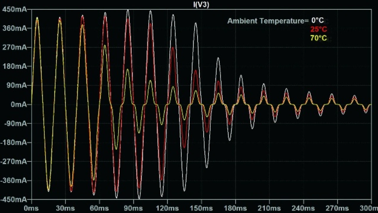SPICE-Modelle sind, wenn sie sorgfältig konzipiert werden (und darauf legen sicher alle Entwickler elektronischer Simulationsmodelle großen Wert), ein getreues Abbild der Spezifikationen. Darüber hinaus werden alle modellierten Spezifikationspunkte in einer Simulation gleichzeitig zusammengefasst und alle Wechselwirkungen zwischen ihnen dargestellt. Spannungsabhängigkeit, Wärmekapazität, Verlustfaktor, Umgebungstemperatureinfluss, Widerstandsabhängigkeit der Temperatur, Auslöse-/Nicht-Auslöse-Strom – die kombinierte Wirkung der Toleranzen all dieser Parameter lässt sich schnell und einfach simulieren. Komplizierte Betrachtungen sind nicht erforderlich. So genügt es, einfach einen PTC auszuwählen, der sich nach eigener Meinung eignen könnte, und die komplexen Zusammenhänge mittels Simulation zu visualisieren.