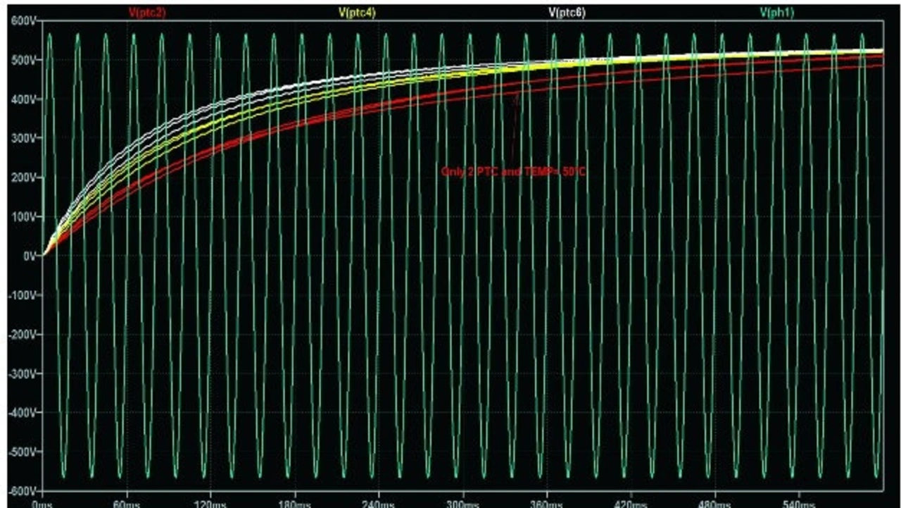 Das Designproblem besteht darin, herauszufinden, wie viele PTCs (in Bild 4 sind es zwei) parallelgeschaltet werden müssen, um sicherzustellen, dass kein PTC im Normalbetrieb schaltet. Denn sonst würde die Spannung über dem Kondensator C1 niemals einen Wert nahe der Maximalamplitude der Wechselspannungsquelle erreichen. Bild 5 zeigt den simulierten Spannungsverlauf an C1 während des Ladens, und zwar bei drei verschiedenen Umgebungstemperaturen (0 °C, 25 °C und 50 °C) und mit zwei (rote Kurve), drei (gelbe Kurve) oder vier (weiße Kurven) parallelgeschalteten PTCs. Zu erkennen ist, dass bei Verwendung von nur zwei PTCs die Spannung über C1 nicht bis an die Wechselspannungsamplitude heranreicht, insbesondere bei höherer Umgebungstemperatur (TEMP). Mit drei oder gar vier PTCs ist man hingegen auf der sicheren Seite.