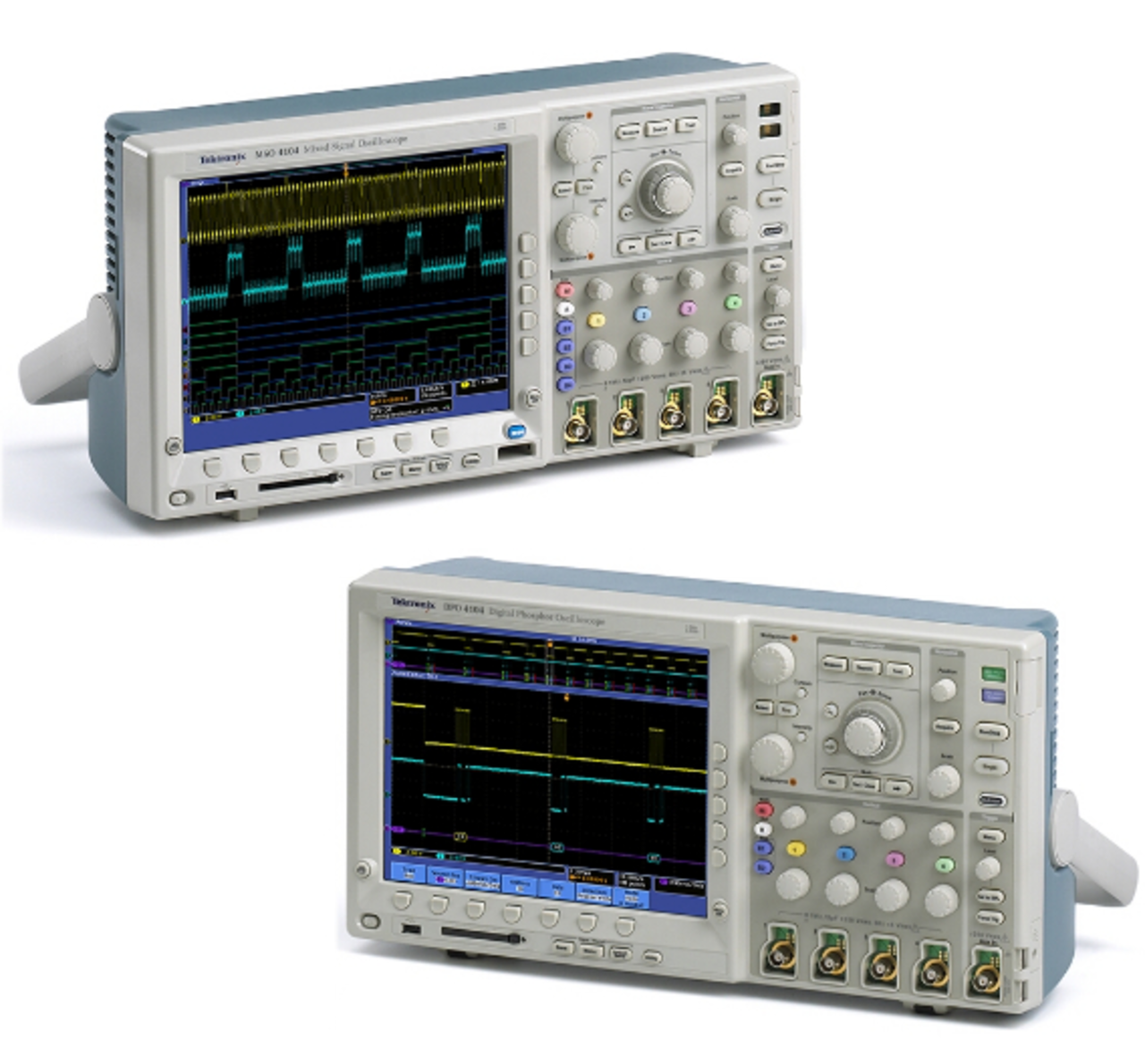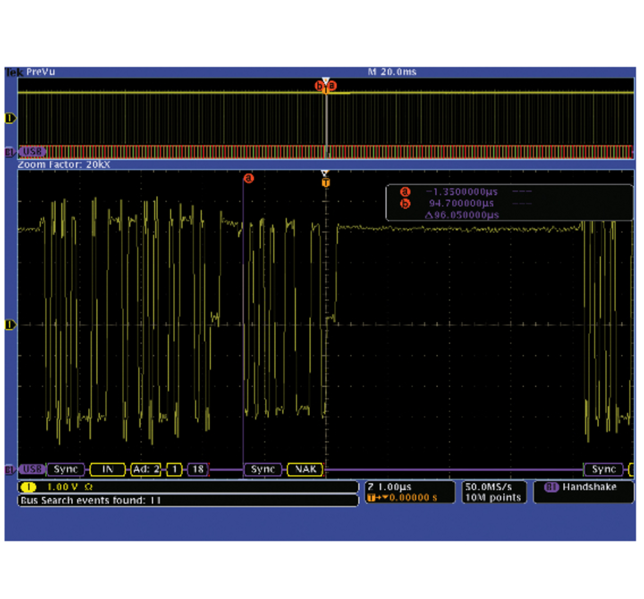 In diesem Beispiel wird ein Tektronix- Oszilloskop der Serie MSO/ DPO4000 (Bild 4) verwendet, um die Latenz eines Full-Speed-USB-Speichergeräts zu prüfen. Dabei wird überprüft, ob das Speichergerät mit einem NAK-Token auf die IN-Token-Anforderung des Computers nach Daten vom Speichergerät antwortet. Zur Messung am USB-Verlängerungskabel zwischen Computer und USB-Speichergerät wird ein Differenz-Tastkopf verwendet. Um am Oszilloskop die Einstellungen für das Decodieren des erfassten Signals vorzunehmen, müssen einige Parameter des Busses festgelegt werden: Geschwindigkeit, Eingangskanäle, Art des Signals (unsymmetrisch oder differenziell) und Schwellenwerte.