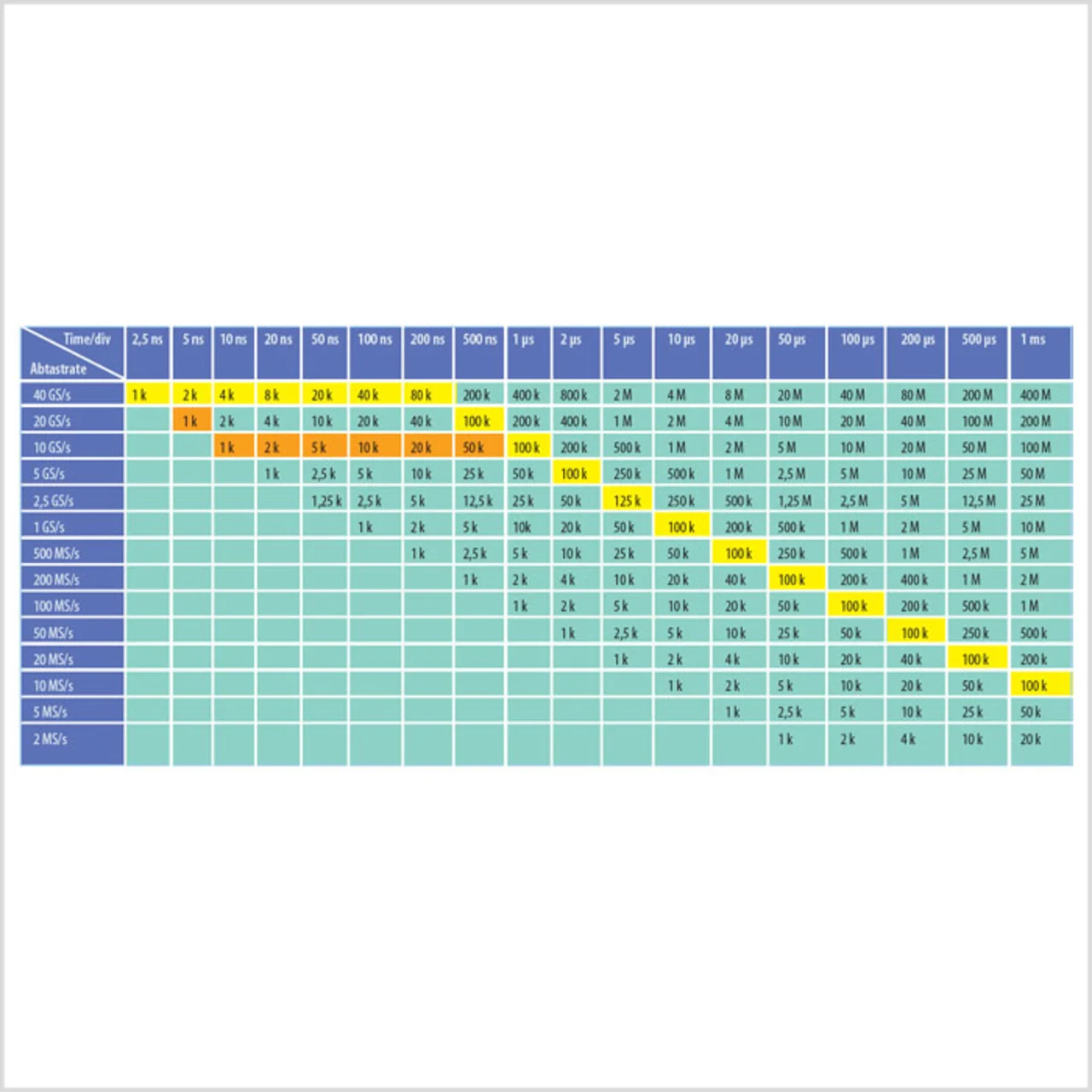Wenn man die vom Oszilloskop möglichst konstant gehaltene Abtastrate ändern möchte, ist darauf zu achten, dass die Aufzeichnungslänge im zulässigen Bereich bleibt. Wenn man beispielsweise die konstante Abtastrate von 2,5 GS/s auf 10 GS/s erhöhen möchte und die Aufzeichnungslänge 200 k Punkte beträgt, kann diese Änderung nur erfolgen, wenn der Wert für die Zeit pro Raster-Teilung (div.; „Division“) zwischen 50 ns/div und 2 μs/div liegt. Die Tabelle verdeutlicht hierfür den Zusammenhang zwischen Abtastrate, Zeitablenk-Faktor und Speichertiefe bei einem DPO7000. Es ist zu beachten, dass die Grenzwerte für die Speichertiefen nicht genau geradzahlig sind und verschiedene Abweichungen zeigen, die sich aus der Geradzahligkeit der Zeitablenkungs-Einstellung ergeben, so dass die Angaben in dieser Tabelle abweichen können.