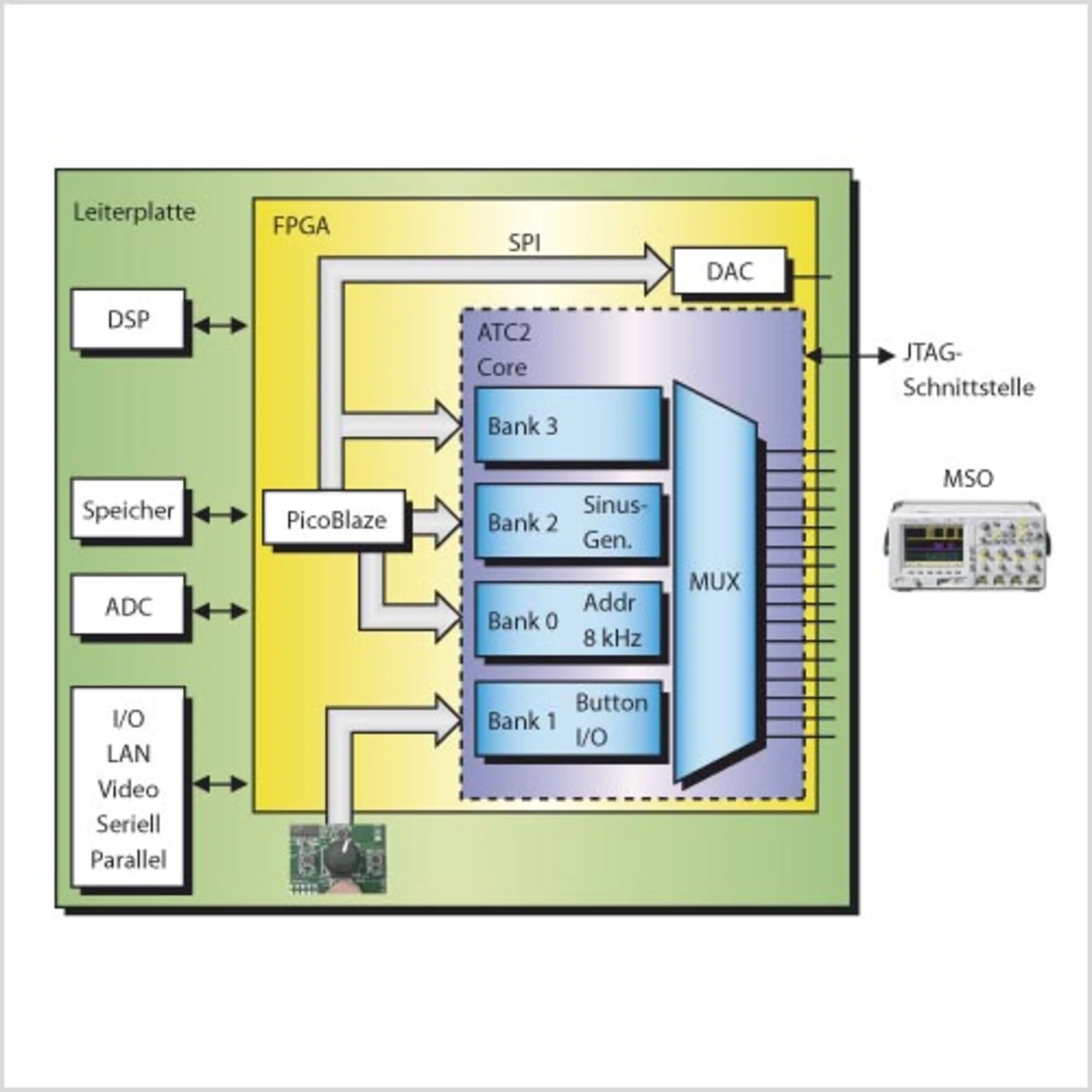 Indem man zum Debugging einen Debugging-Kern verwendet, spart mal viel Zeit und nutzt die fürs Debugging reservierten zwölf FPGA-Pins optimal aus. Debugging-Kerne für MSOs arbeiten im Multiplexverfahren. Ein Entwicklungsingenieur legt fest, welche Sätze von Signalen er gerne gleichzeitig messen möchte. Jeder Satz besteht aus so vielen Signalen, wie Pins für Debug-Zwecke zu Verfügung stehen. Eine spezielle Software namens „FPGA dynamic probe“ steuert den Debugging-Kern und überträgt die Namensdateien vom CAD-System in das MSO.