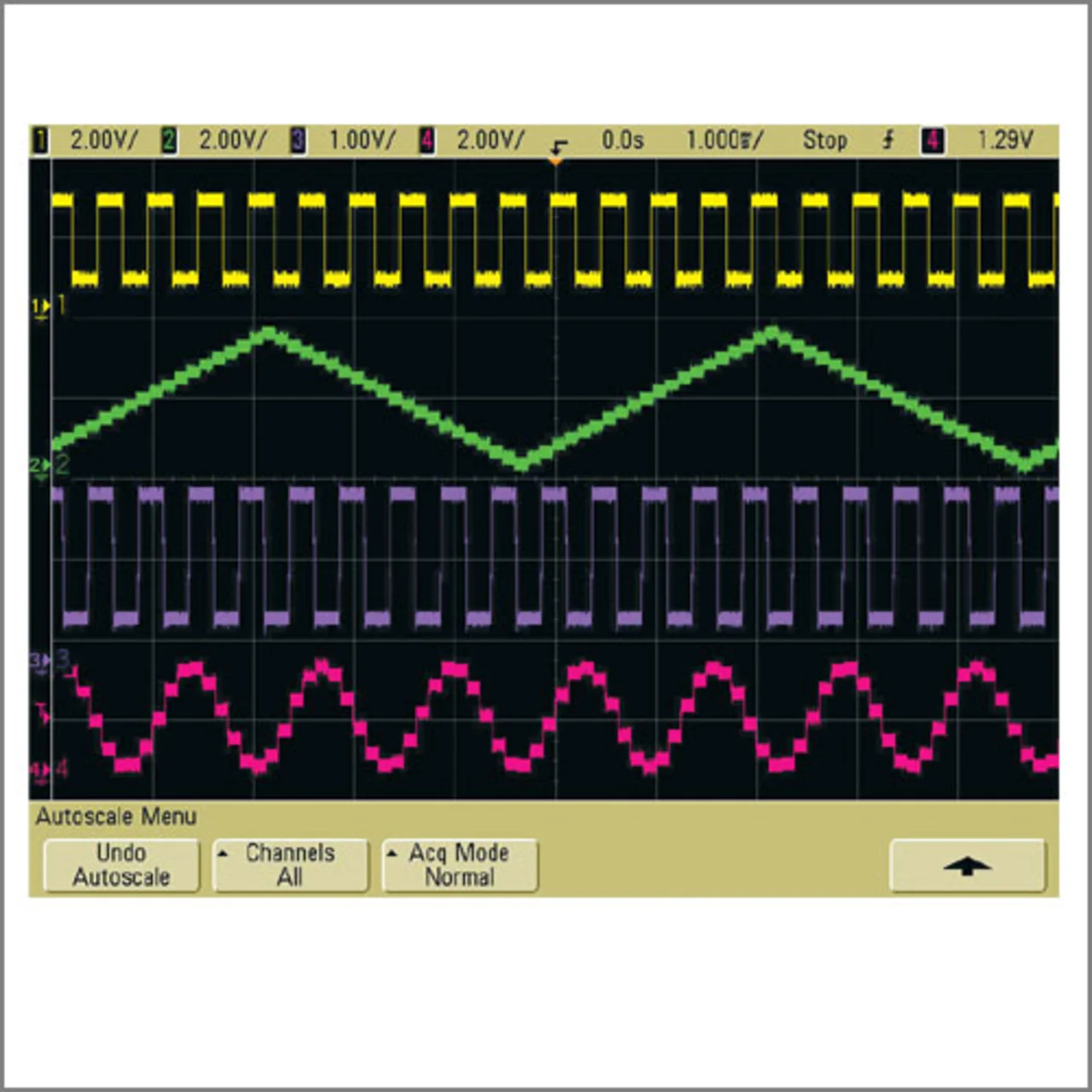 Was die reinen Oszilloskop-Fähigkeiten anbelangt, bieten Mixed-Signal-Oszilloskope sämtliche Möglichkeiten digitaler Speicheroszilloskope und sind somit hervorragend geeignet, analoge Signale zu validieren (Bild 1). Im Folgenden wird ein Digital-Analog-Wandler-Subsystem untersucht, bestehend aus einem FPGA des Typs Spartan-3E von Xilinx und einem Digital-Analog-Wandler-Chip. Das Design wurde mit einem Spartan-3E-Protypen-Entwicklungssystem aufgebaut. Das FPGA enthält einen PicoBlaze-Prozessor, der mit 50 MHz läuft und Sinus-Theta-Werte erzeugt, die an den DAC ausgegeben werden.